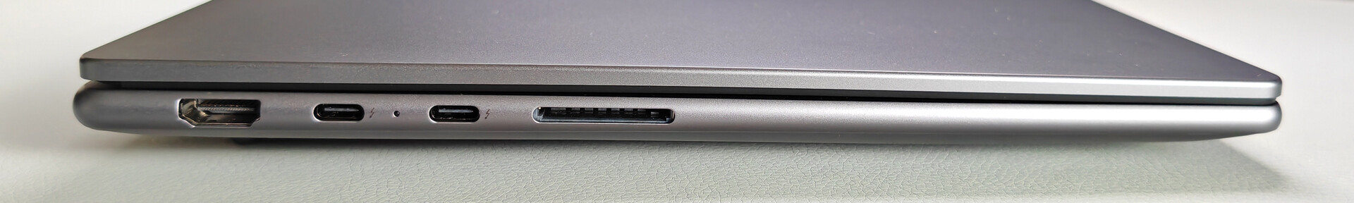 Nasze urządzenie testowe Intela jest szare, ale poza tym obudowa nie różni się od wersji AMD. Zgodnie z oczekiwaniami, złącza obsługują Thunderbolt 4, ale pełnoprawny czytnik kart SD po lewej stronie jest nieco bardziej zaskakujący. Szybkość transferu wynosi średnio ~80 MB/s, ale karty nie mogą być włożone bardzo daleko i siedzą bardzo luźno, dlatego karty pamięci mogą szybko wypaść.