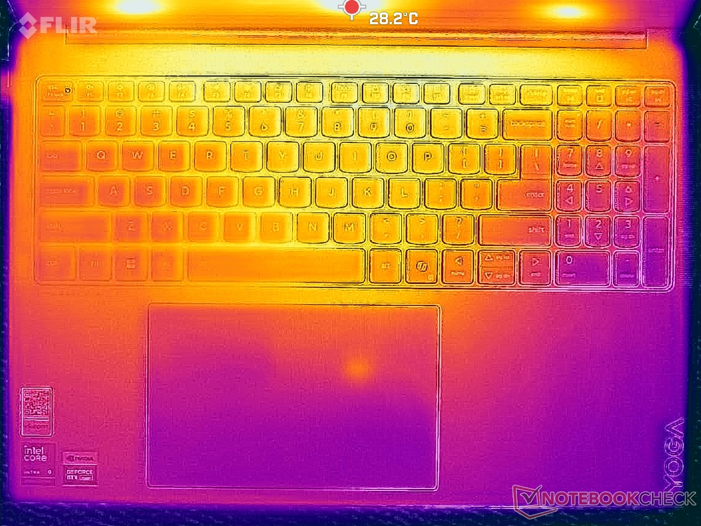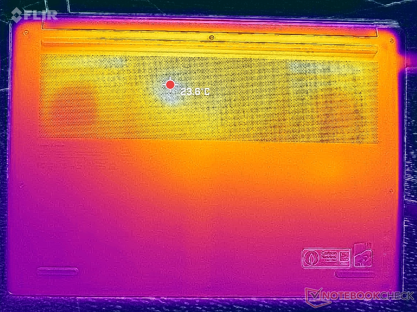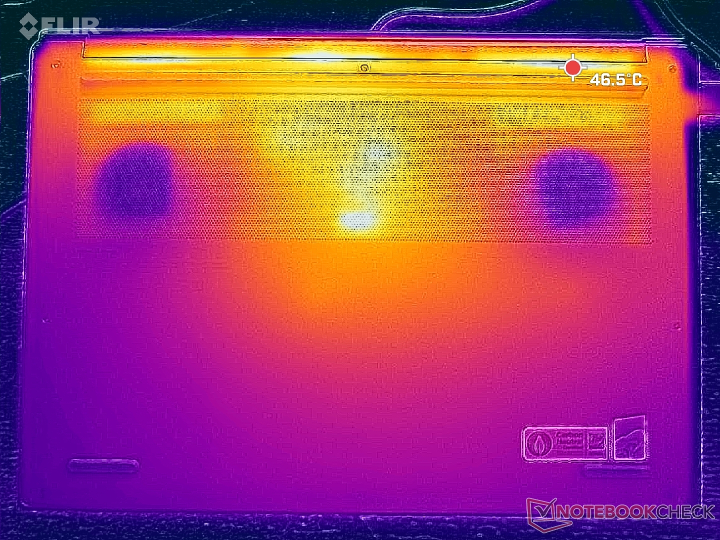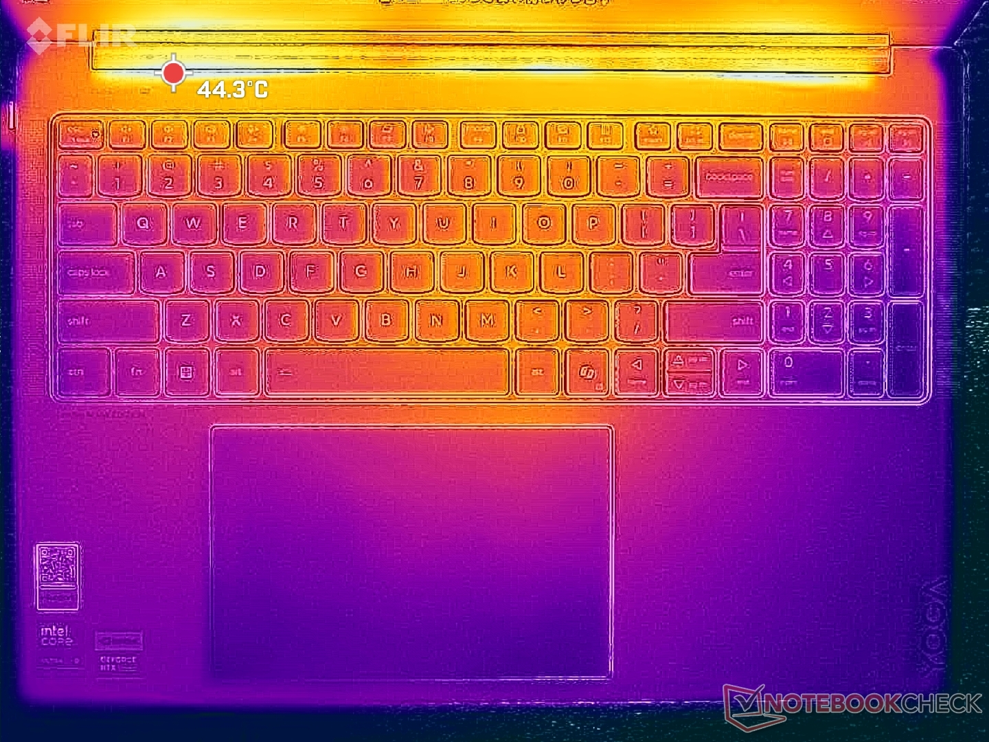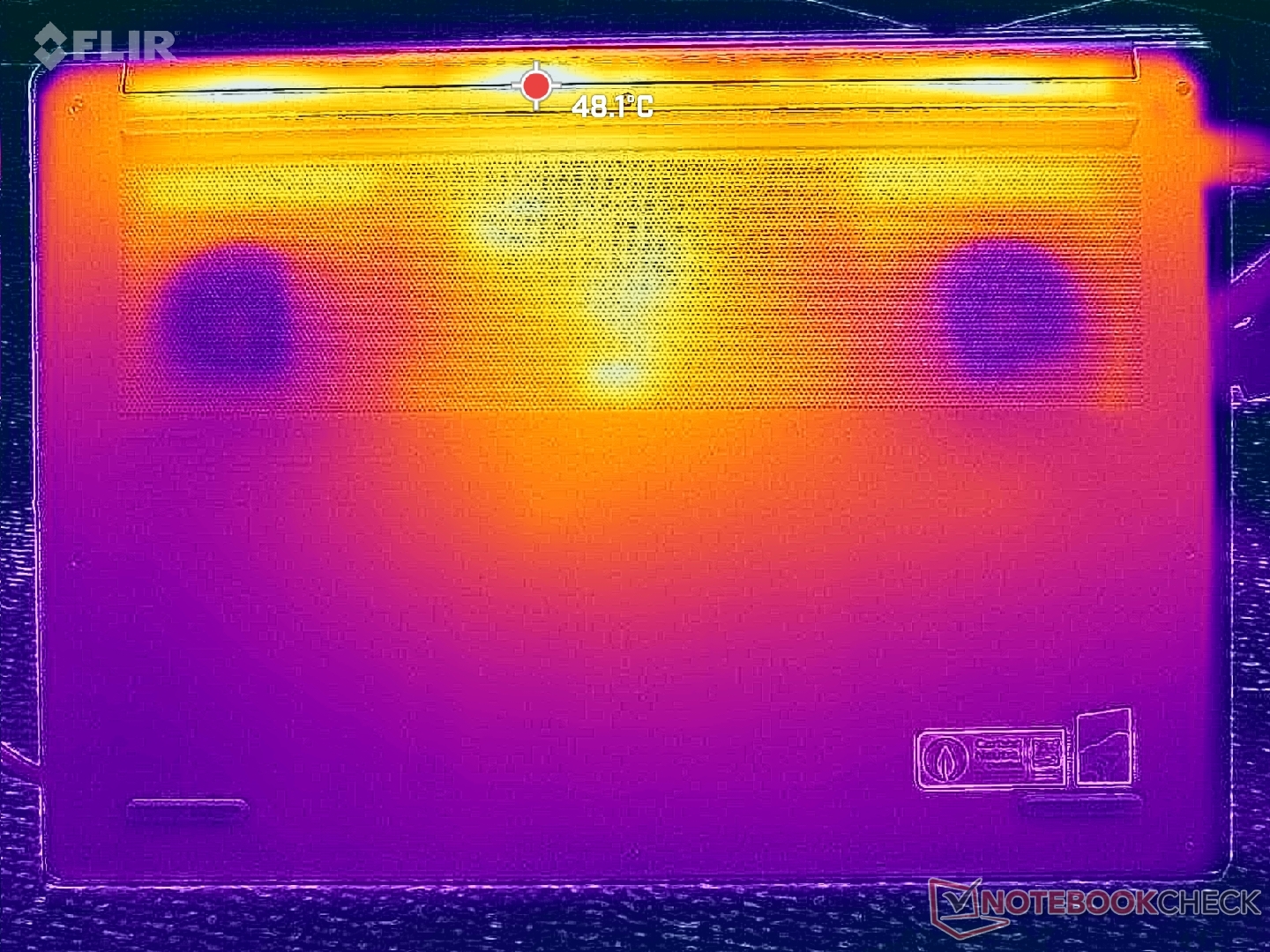 Temperatury powierzchniowe podczas pracy z wymagającymi obciążeniami są zauważalnie niższe niż te, które zarejestrowaliśmy na konfiguracji RTX 5070. Gorące punkty podczas pracy na biegu jałowym w grze Cyberpunk 2077 osiągały odpowiednio nieco ponad 35 C i 42 C na klawiaturze i dolnej pokrywie, w porównaniu do 42 C i 46 C na szybszej jednostce RTX 5070.