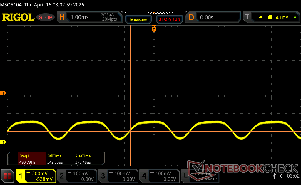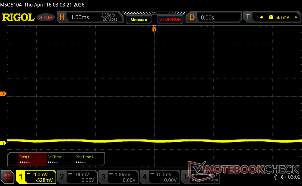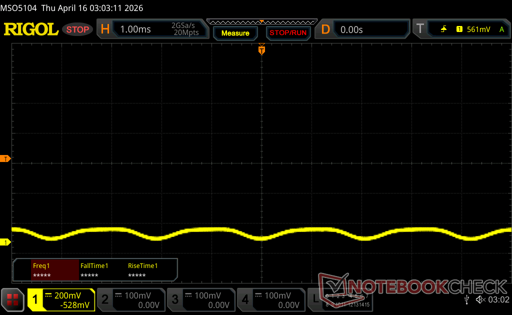 Podświetlenie wyświetlacza miga z częstotliwością 479.46 Hz (najgorszy przypadek, np. przy użyciu PWM) Wykryto migotanie przy ustawieniu jasności 100 % i poniżej. Powyżej tego ustawienia jasności nie powinno być żadnego migotania ani PWM. Częstotliwość 479.46 Hz jest stosunkowo wysoka, więc większość użytkowników wrażliwych na PWM nie powinna zauważyć żadnego migotania. Istnieją jednak doniesienia, że niektórzy użytkownicy są nadal wrażliwi na PWM przy częstotliwości 500 Hz i wyższej, więc należy zachować ostrożność. Dla porównania: 52 % wszystkich testowanych urządzeń nie używa PWM do przyciemniania wyświetlacza. Jeśli wykryto PWM, zmierzono średnio 7898 (minimum: 5 - maksimum: 343500) Hz. | |||
