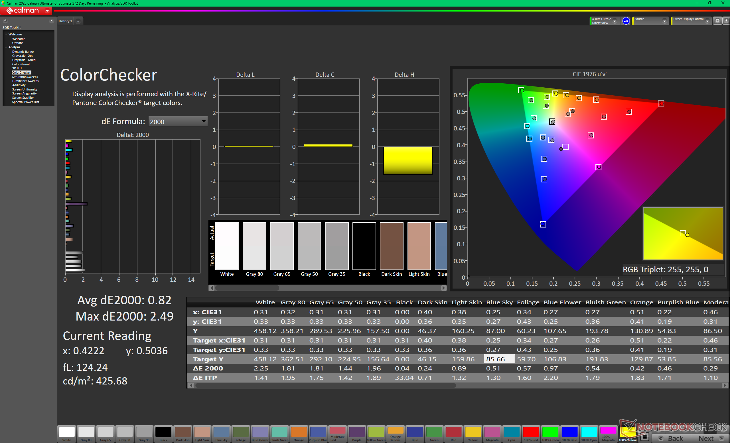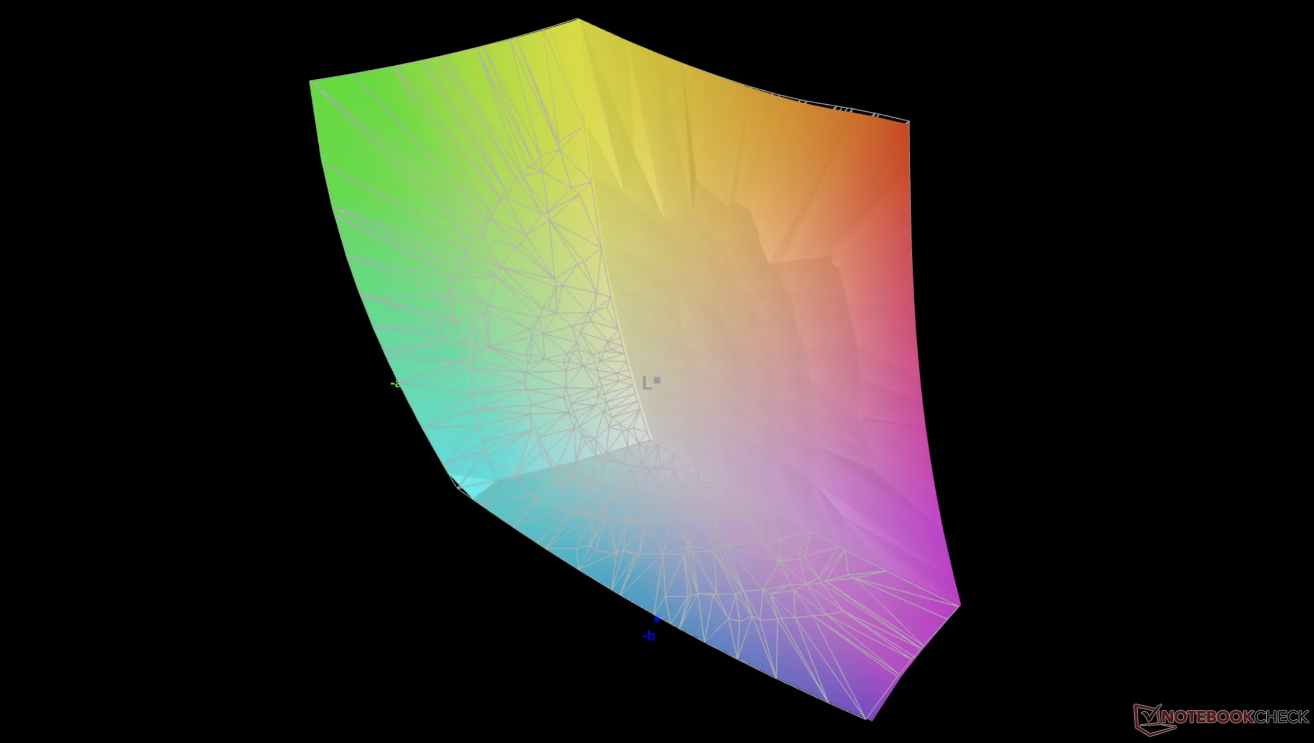 Wyświetlacz jest dobrze skalibrowany względem standardu P3 ze średnimi wartościami deltaE w skali szarości i koloru wynoszącymi odpowiednio tylko 0,6 i 2,21.