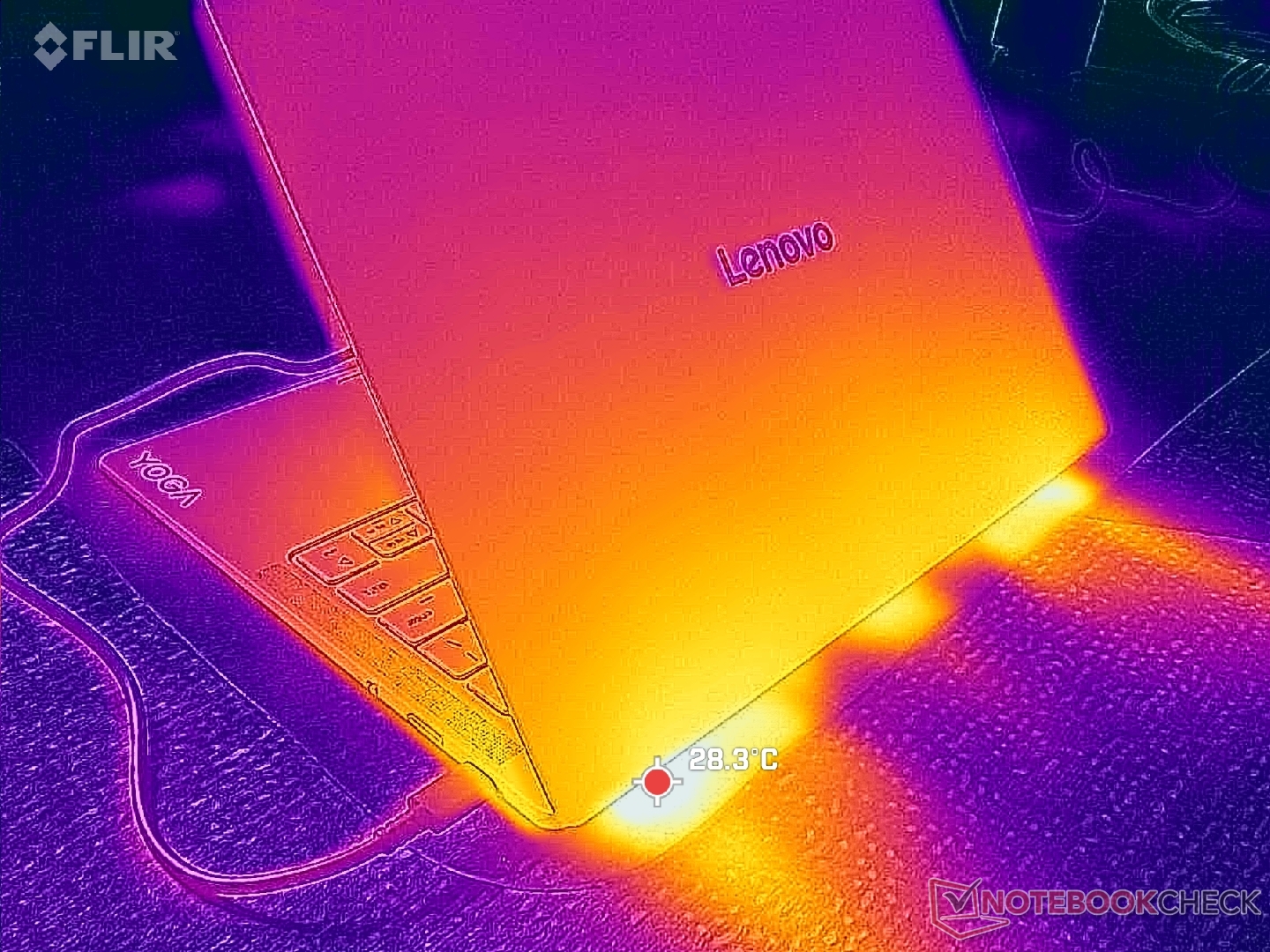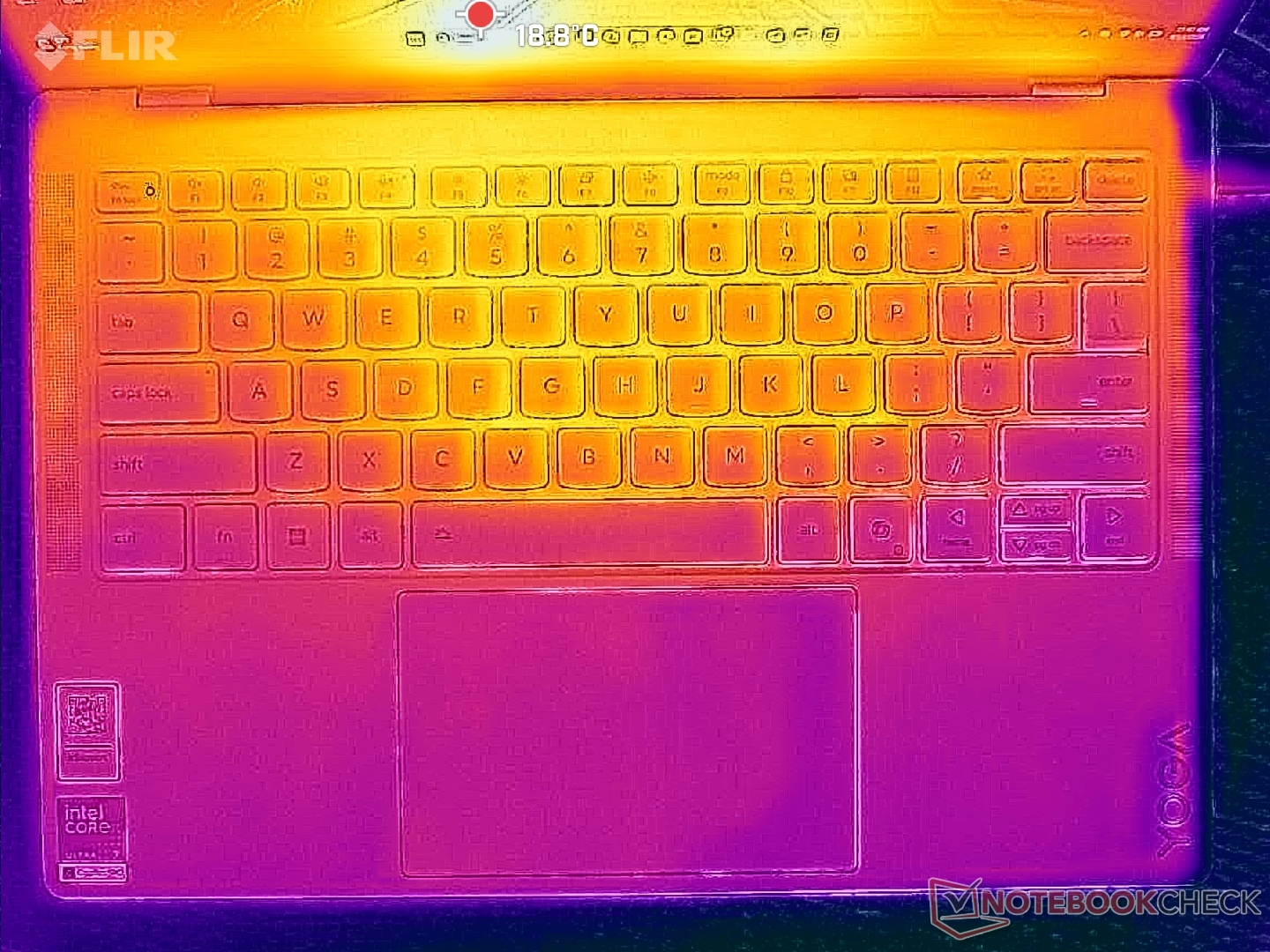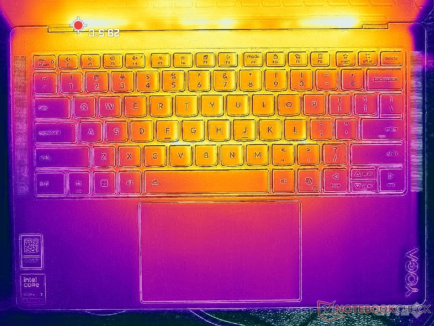 Temperatury powierzchni są stosunkowo niskie, nawet podczas pracy z wymagającymi obciążeniami. Gorące punkty osiągają zaledwie 34 C w porównaniu do ponad 43 C na HP OmniBook Ultra 14.