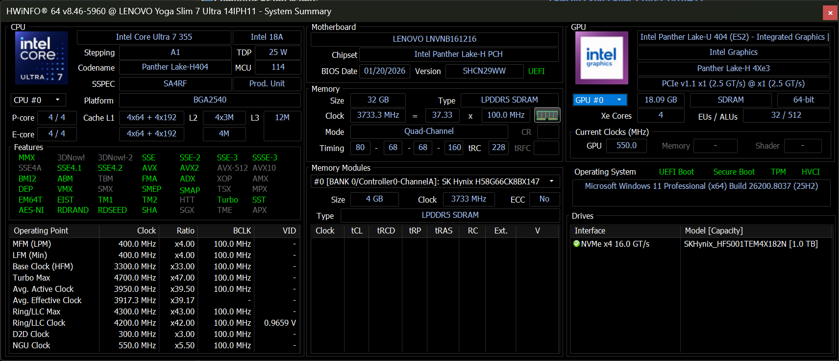 | Lenovo Yoga Slim 7 Ultra 14IPH11 Intel Core Ultra 7 355 ⎘ Intel Graphics 4 Xe3 Panther Lake iGPU ⎘ 32 GB Pamięć, 1024 GB SSD | Amazon: Cena katalogowa: 1700 USD | 978 g | 13.9 mm | 14.00" 2880x1800 243 PPI OLED | |