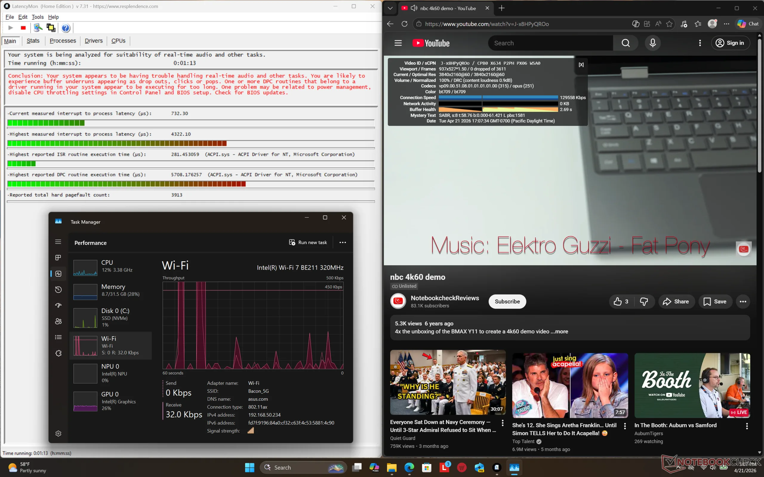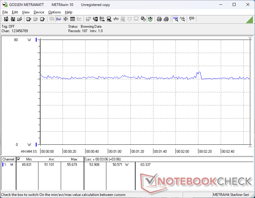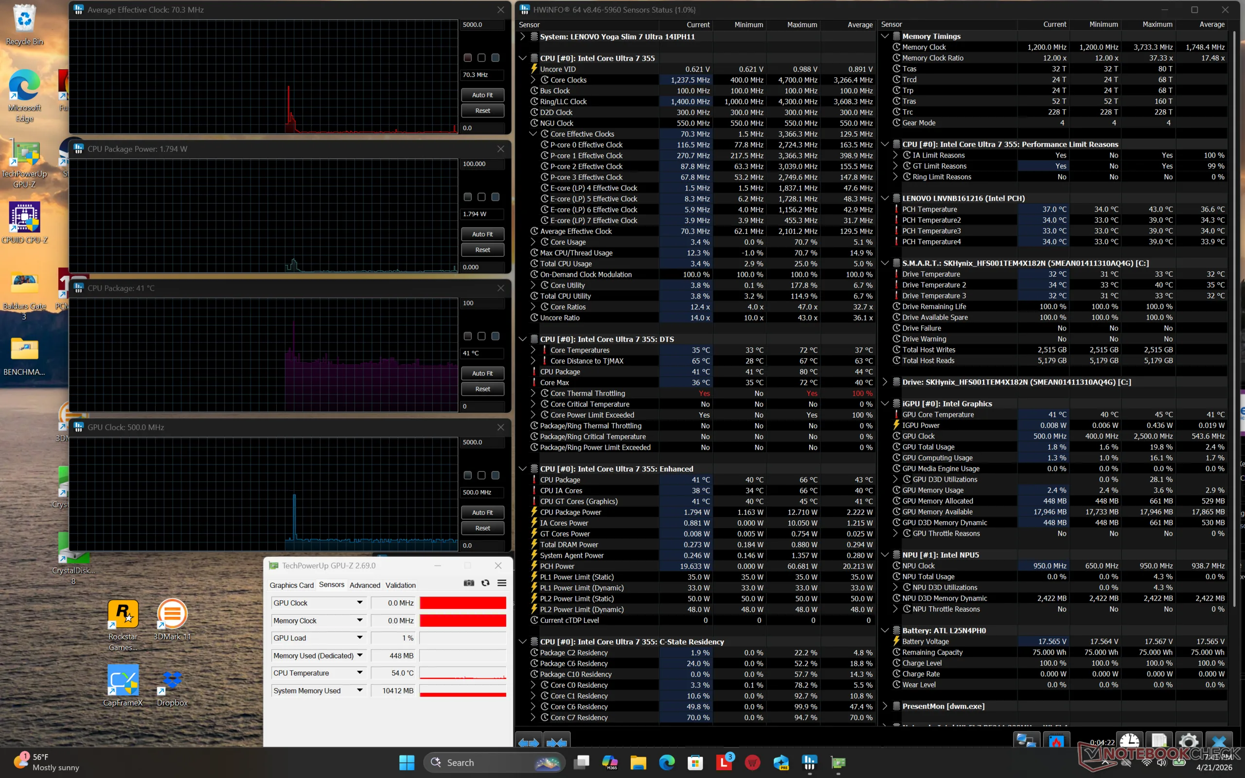 Zużycie energii podczas korzystania z Prime95 byłoby o około 12 procent niższe niż w przypadku napędzanej przez AMD Yoga Slim 7a 14 mimo że nasz procesor Intela jest o 20 procent szybszy, co przekłada się na wyższą wydajność w przeliczeniu na wat w porównaniu do konkurenta Ryzen AI 400. Podobnie, zarówno wydajność, jak i wydajność na wat ponownie byłyby nieco na korzyść Intela, gdy GPU jest obciążony.