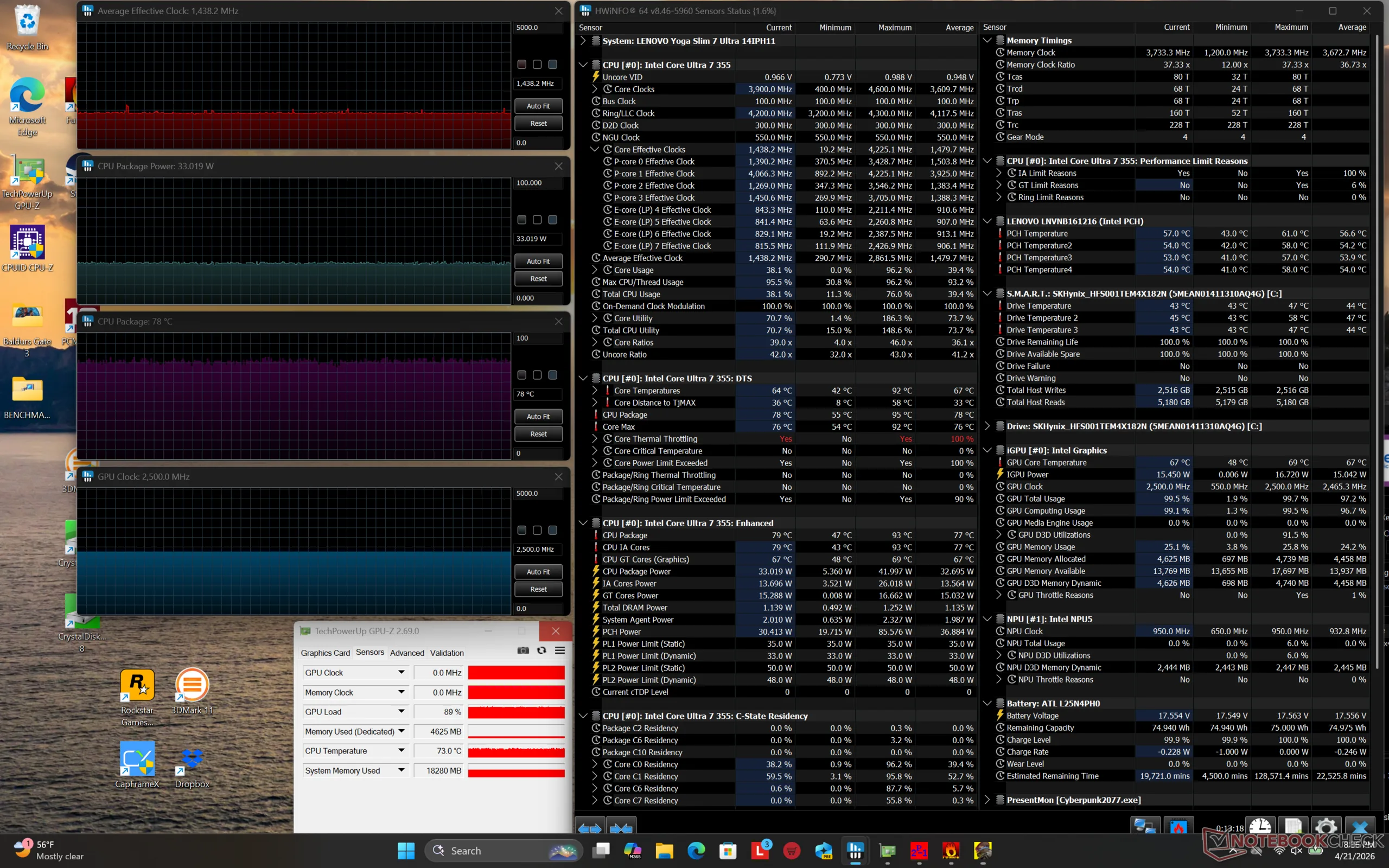 Częstotliwość taktowania GPU i temperatura podczas uruchamiania Cyberpunk 2077 ustabilizowałyby się odpowiednio na poziomie 2500 MHz i 78 C, co jest prawie dokładnie tym, co zarejestrowaliśmy na konkurencyjnym XPS 14 w podobnych warunkach.