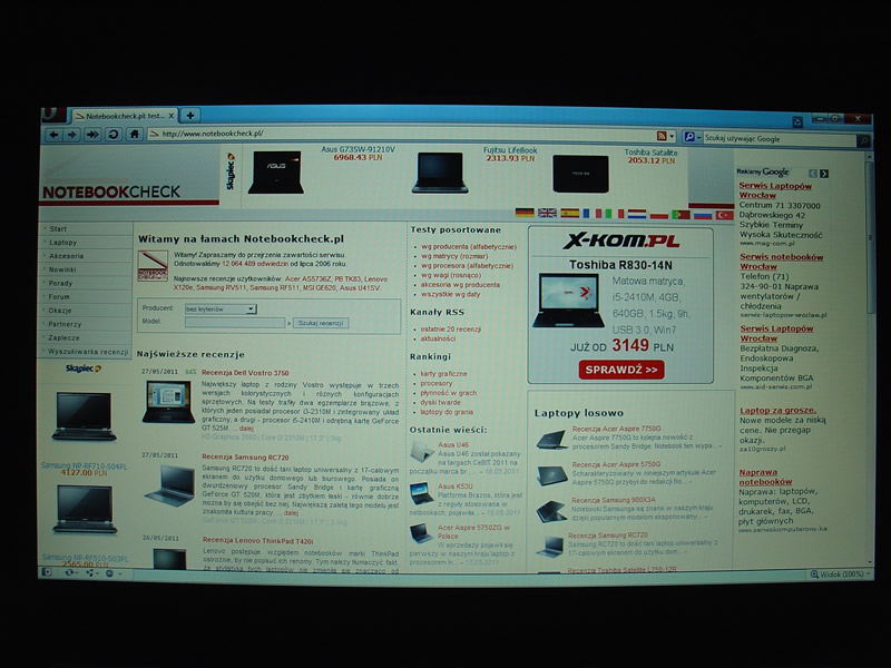 Jak widać na poniższych wykresach, zbieżność kolorów z podstawową paletą RGB nie jest zadowalająca i wymaga kalibracji. Niezadowolenie budzi też nierównomierność podświetlenia ekranu; różnica między środkową częścią a lewym górnym rogiem to prawie 50 cd/m². Pozytywem jest natomiast zakres przestrzeni barw, przewyższający znacznie to, co oferują matryce instalowane w droższych laptopach (np. w MSI GE620). Nieźle prezentują się także szerokie jak na tę klasę laptopa kąty widzenia, które standardowo cechują się znacznie większym zakresem w poziomie niż w pionie.