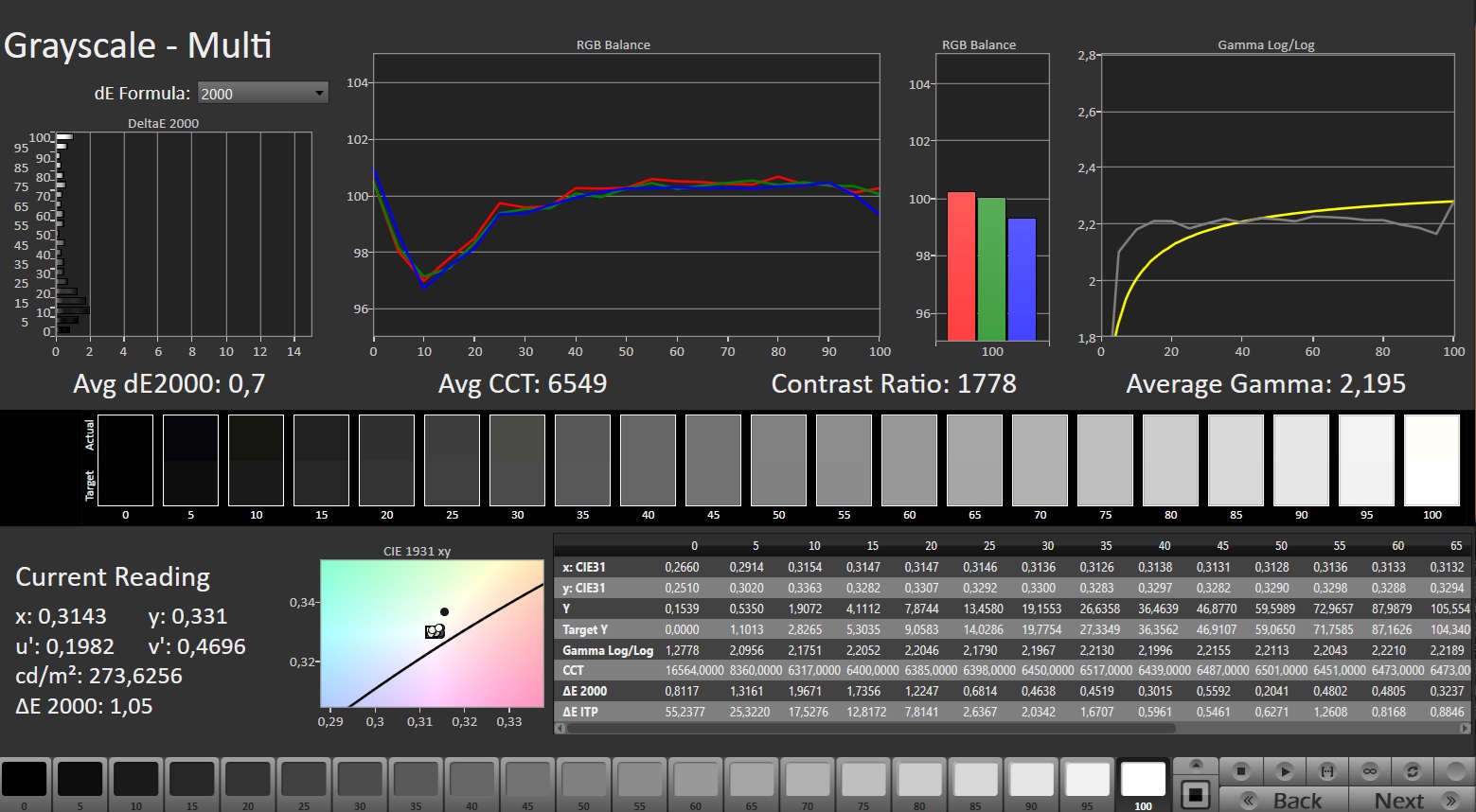 | Greyscale dE 2000 * | 3.9 | 2.16 45% | 2.4 38% | 3.9 -0% | 1.9 51% | 1.2 69% |