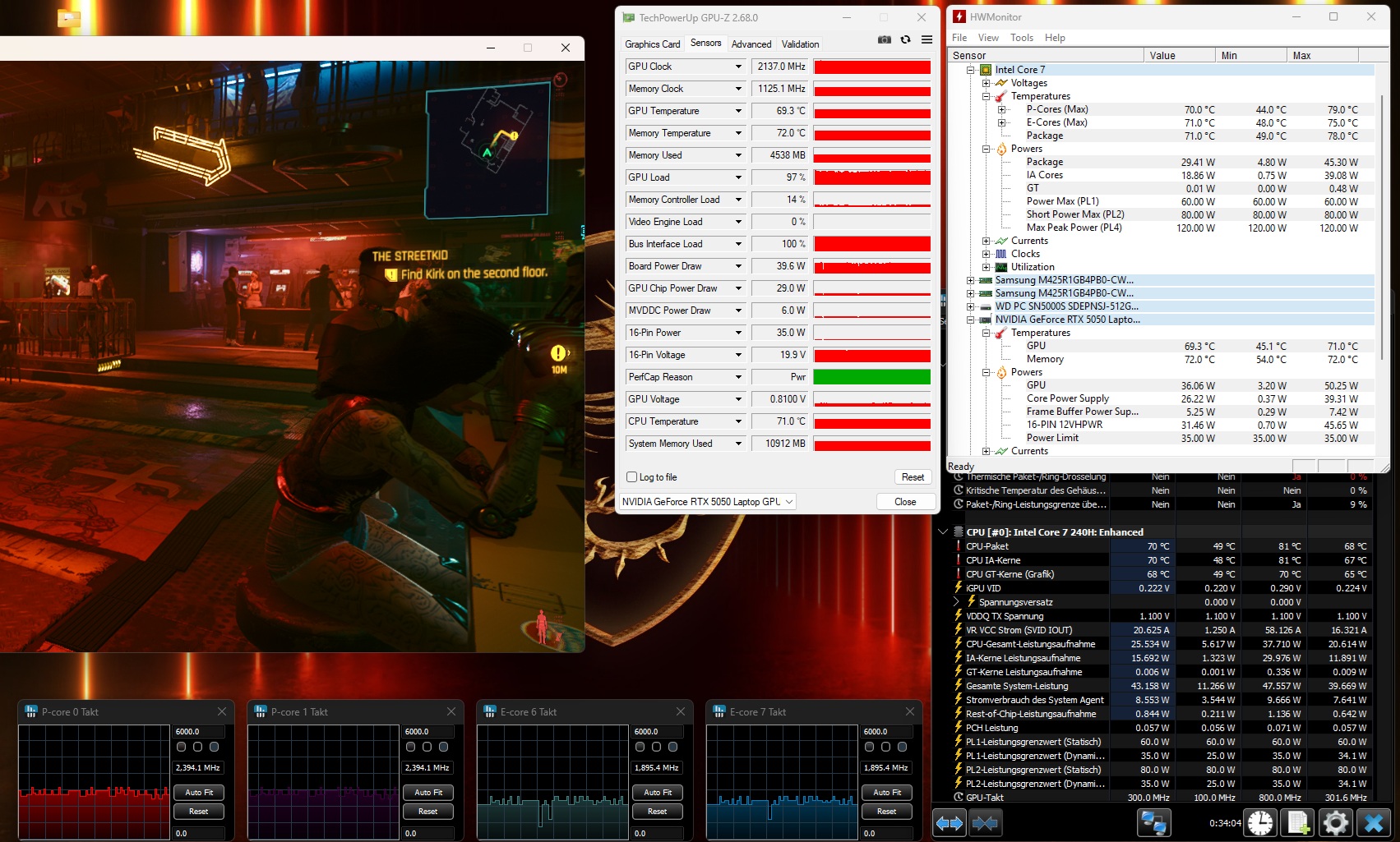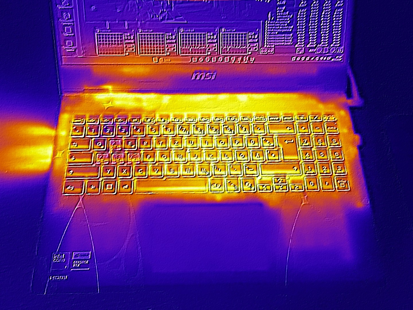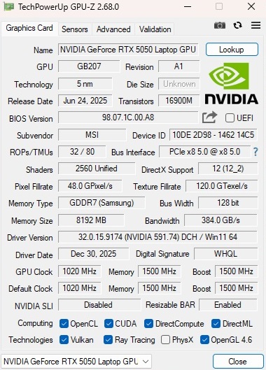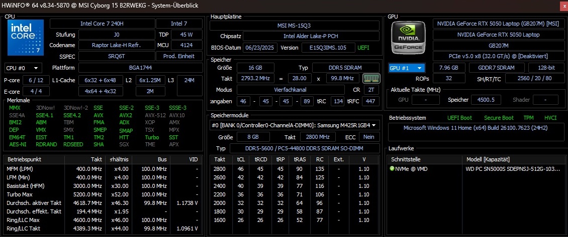Moc karty graficznej jest również warta omówienia: Ponieważ MSI daje RTX 5050 tylko skromne 45 watów TGP, wydajność GPU jest niższa od jego potencjału, co pokażemy w trakcie artykułu, chociaż rozwój hałasu jest ograniczony. Reszta sprzętu jest solidna, ale nie wystawna jak na tę cenę, z Core 7 240H, 16 GB DDR5 RAM (2x 8 GB) i 512 GB SSD. W międzyczasie są plusy za prywatną migawkę kamery internetowej, która nie jest dana w szczególności w przypadku laptopów do gier.