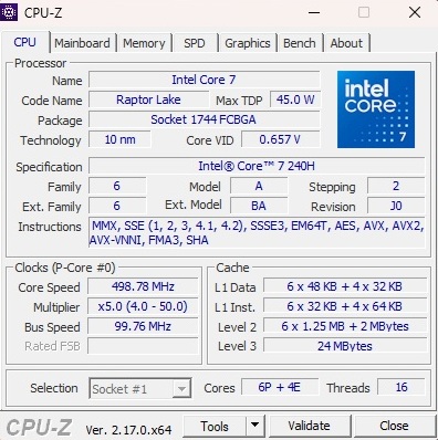 Z zainstalowanym Core 7 240H to 10 nm model z generacji Raptor Lake, który zawiera sześć wydajnych rdzeni z obsługą Hyper-Threading i cztery wydajne rdzenie bez HT, co daje łącznie 16 równoległych wątków. W rankingu procesorów układ ten plasuje się pomiędzy modelami Core i5-13420H z Victusa 15 lub Acer Nitro V 15, a procesorem Core i7-12650H starego Cyborga 15. Konkurencja ze strony AMD wysuwa się na prowadzenie, przynajmniej w postaci modeli Ryzen 7 250 (Lenovo LOQ 15) lub Ryzen 7 260 (Lenovo Legion 5 15).