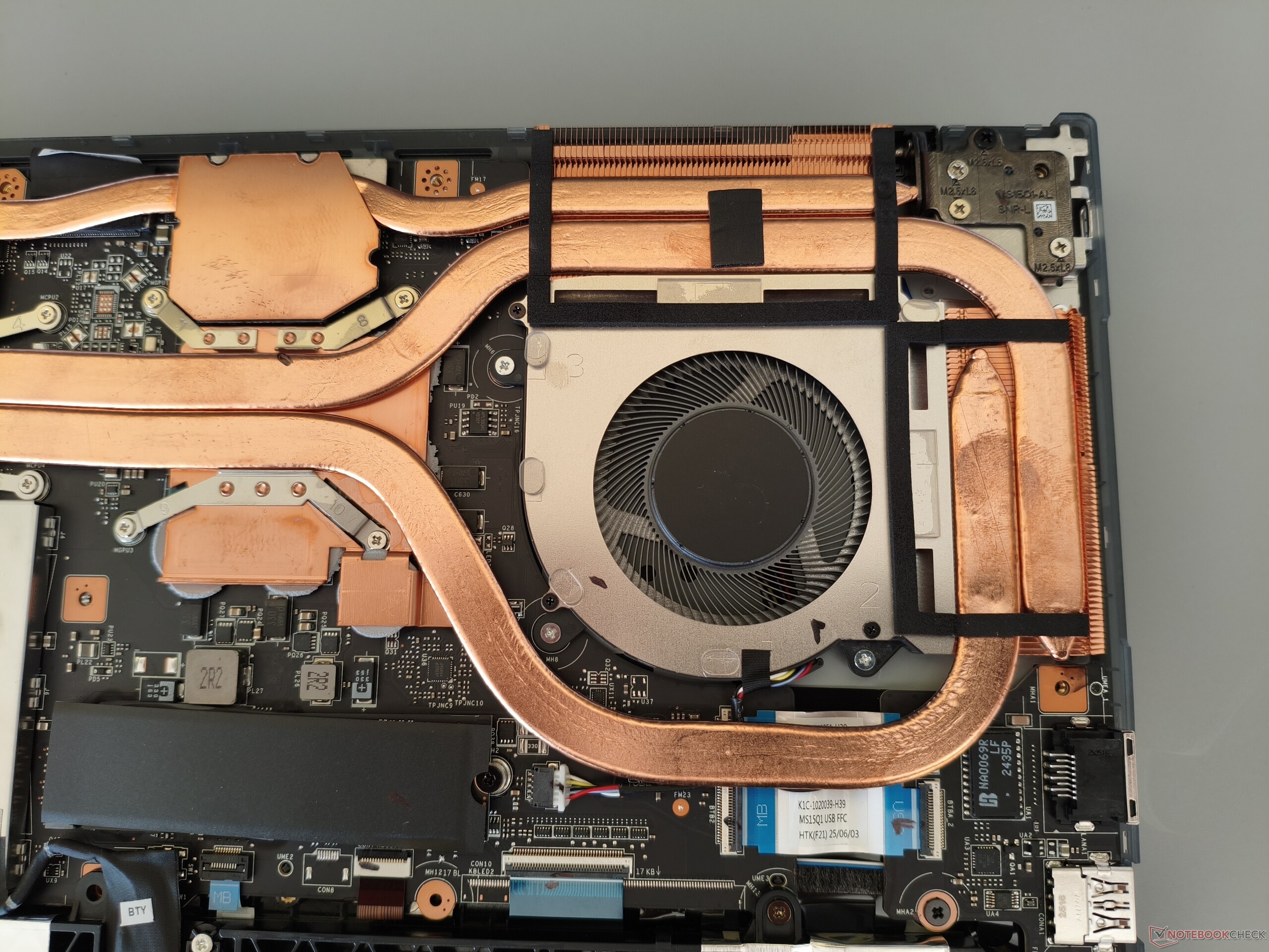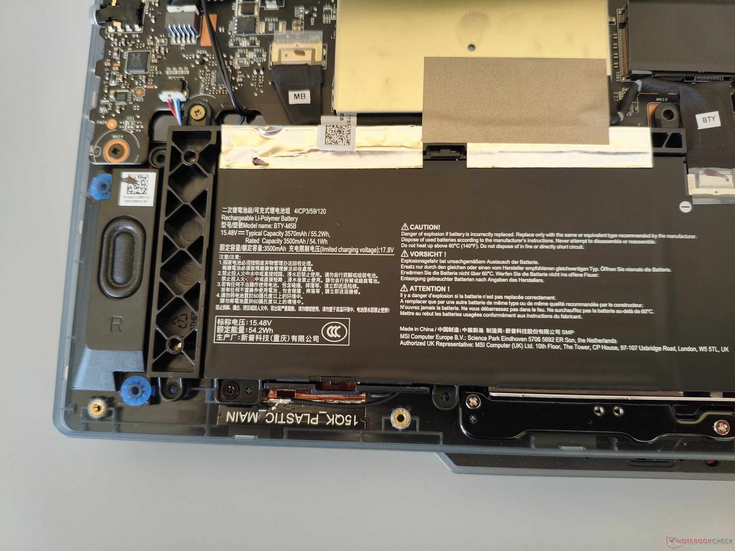 W obudowie zastosowano mieszankę metalu (pokrywa) i plastiku (podstawa). W większości przypadków jakość wykonania i stabilność nie dają powodów do krytyki. MSI zasługuje na szczególną pochwałę za duży kąt otwarcia wynoszący 180°. Z wagą nieco poniżej 2,2 kg (~4,9 funta), Cyborg 15 wygodnie plasuje się pośrodku konkurencji, która waży od 1,9 do 2,4 kg (~4,2 do 5,3 funta). Aby otworzyć obudowę, należy odkręcić 12 śrub krzyżakowych. Jak wygląda obudowa pod maską, mogą Państwo zobaczyć na poniższych zdjęciach.