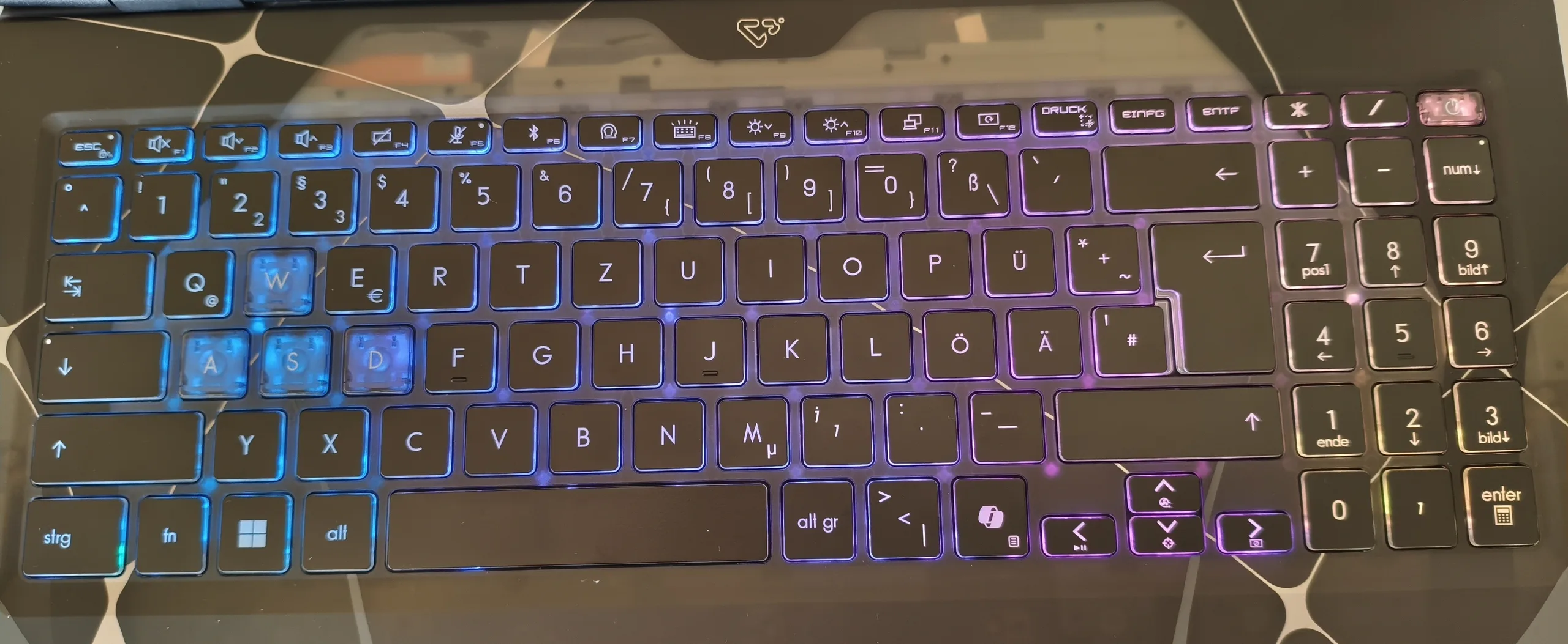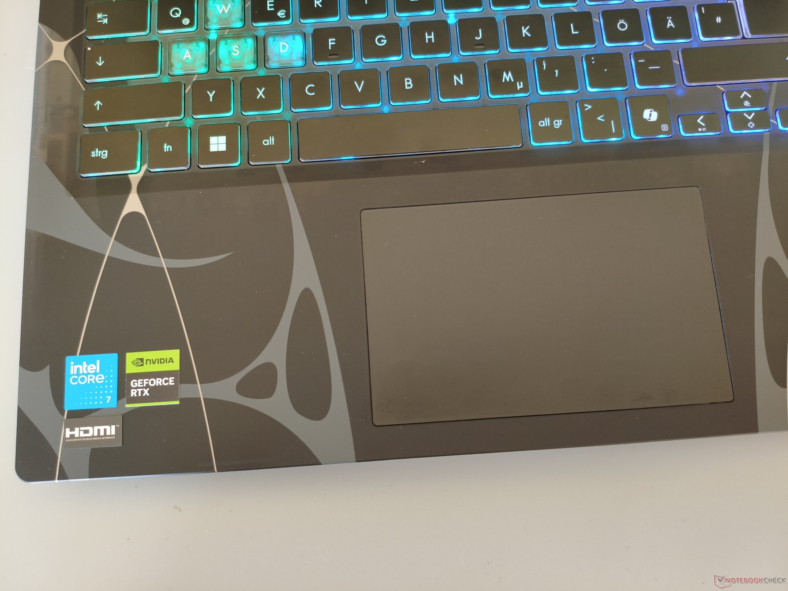 Klawiatura wymaga pewnego oswojenia ze względu na specyficzny układ typowy dla MSI. Fakt, że klawiatura numeryczna ma tylko trzy kolumny zamiast czterech, również wymaga przyzwyczajenia. Sam komfort pisania określilibyśmy jako solidny. Gracze mogą również oczekiwać stosunkowo mocnego podświetlenia RGB. Touchpad ma wymiary 12 x 7,6 cm (~ 4,7 x 3,0 cala), co jest więcej niż wystarczające dla 15-calowego urządzenia. Zamiennik myszy wypadł w teście na zadowalającym poziomie pod względem precyzji, właściwości ślizgowych i gestów.