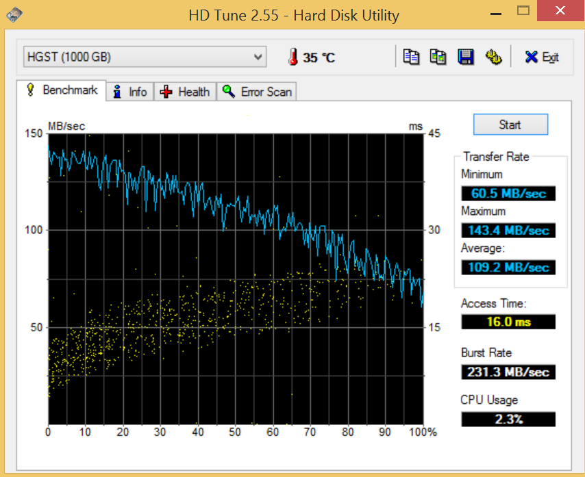 W odróżnieniu od modelu z recenzji Notebookcheck.com prezentowany laptop nie dysponował dyskiem SSD, ale za to wyposażono go w bardzo szybki i pojemny dysk talerzowy HGST HTS721010A9E630. „Kręci” się on z prędkością 7200 obrotów na minutę, jest wyposażany w 32 MB pamięci cache oraz wykorzystuje interfejs SATA 3 (6 Gb/s). W teście HD Tune prędkość liniowego odczytu nie spadła poniżej 60 MB/s, średnia to blisko 110 MB/s, a odczyt maksymalny osiągnął ponad 140 MB/s.