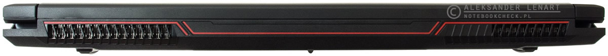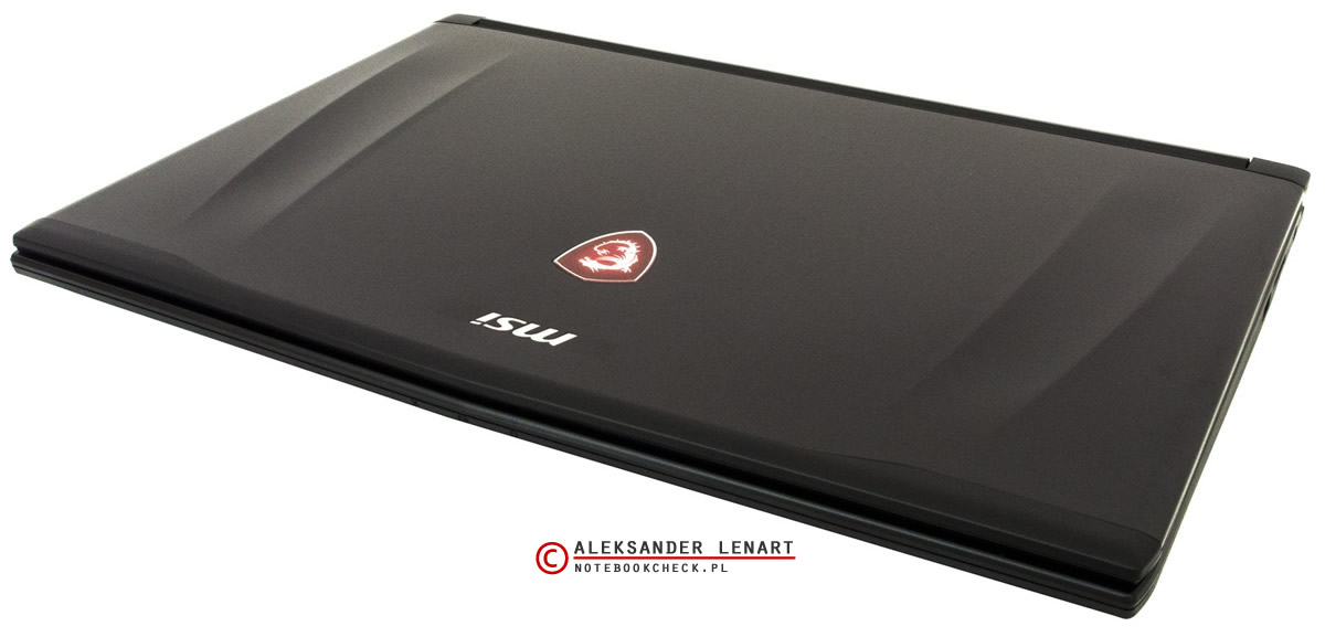 Pokrywa matrycy GP72MVR, podobnie jak w laptopach należących do wyżej lokowanej serii GE, ma czarną barwę i jest urozmaicona wytłoczeniami, zaś jej środek jest ozdobiony logo smoczej armii. Sam dekiel jest wykonany ze szczotkowanego aluminium i całkiem znośnie zabezpiecza wyświetlacz przed zakłóceniami, które mogłyby powstać na skutek nacisku. Niestety materiał ten jest podatny na zatłuszczenie i odciski palców – utrzymanie świeżego wyglądu wymaga sporo wysiłku i regularnego czyszczenia ściereczką.