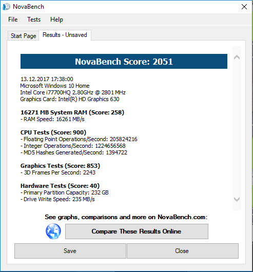 W teście wielowątkowym aplikacji Cinebench R15 procesor Core i7-7700HQ z omawianego laptopa. Jest to rezultat minimalnie lepszy od średniego dla tego CPU z naszej bazy danych (734 pkt.).