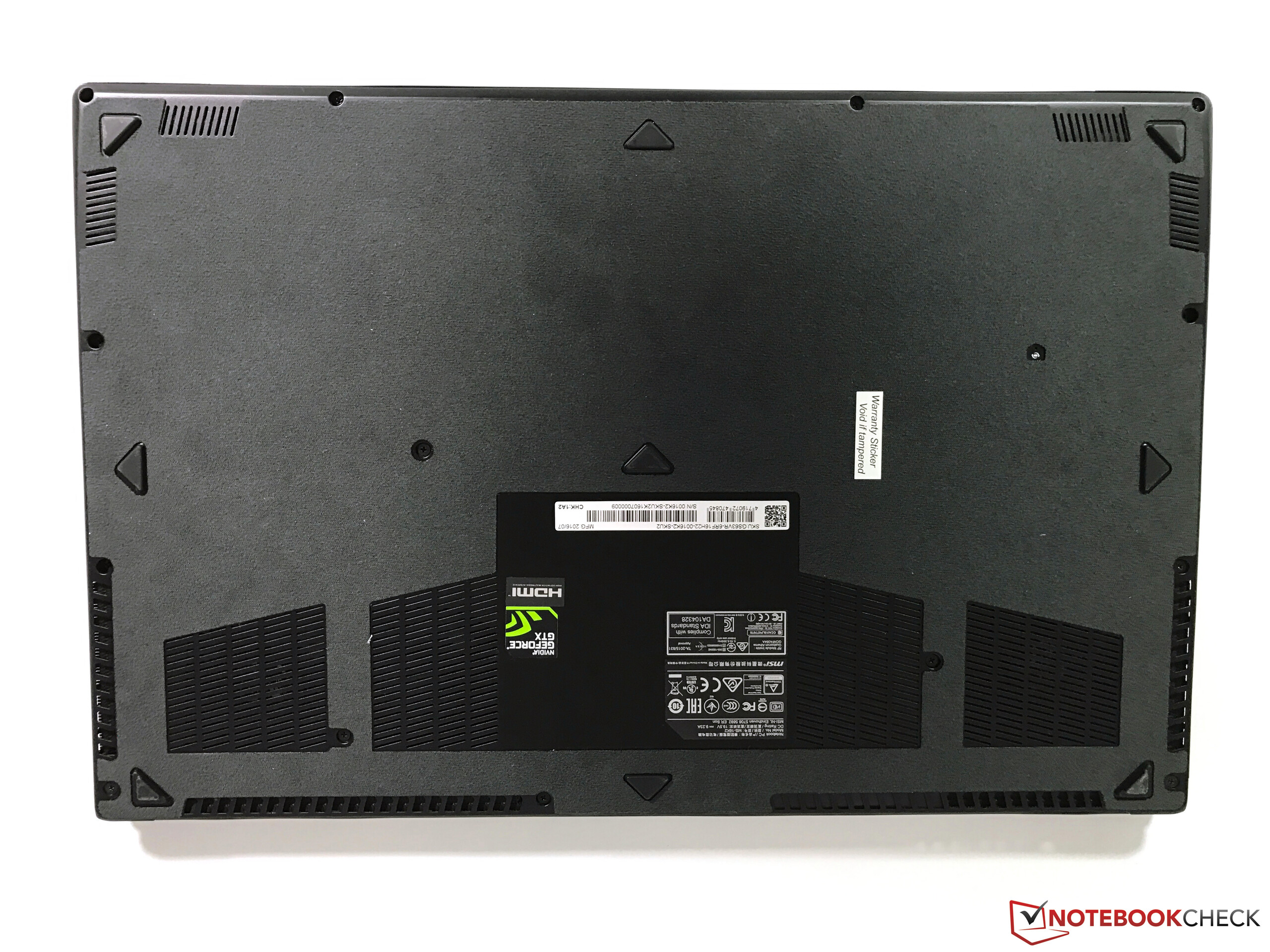 By dostać się do podzespołów wewnętrznych, trzeba zdjąć spodnią osłonę jednostki zasadniczej. Trzyma się ona na licznych śrubkach i plastikowych zaczepach. Umożliwia dostęp do akumulatora, karty Wi-Fi oraz dysku 2,5". Procesor i karta grafiki są wlutowane i nie da się ich wymienić.