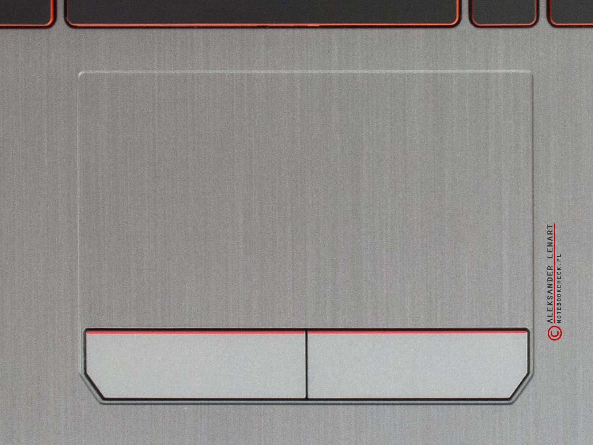 Płytka dotykowa znajdująca się na wyposażeniu MSI GV62 7RD ma gładką, niepodrażniającą palców powierzchnię o wymiarach 10,8 x 6,1 cm. Gładzik został minimalnie obniżony względem reszty pulpitu roboczego, dzięki czemu nie ma obawy o omsknięcie się palca poza wyznaczony obszar. Omawiany przyrząd ma dwa wydzielone przyciski, które cechują się płytkim skokiem oraz wyraźnie słyszalnym klikiem. Płytka dotykowa pracuje pod kontrolą sterownika Synaptics Touchpad V1.1, dzięki któremu można dostosować ustawienia do własnych potrzeb.