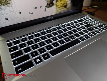 Układ jest schludny, z (wąską) klawiaturą numeryczną znajdującą się po prawej stronie. Jednakże, MSI to MSI, klawisz Fn jest domyślnie umieszczony po prawej stronie Spacji, więc użytkownik może przez pomyłkę trafić w klawisz Windows, ponieważ jest on duży i umieszczony dokładnie tam, gdzie normalnie znajduje się Fn. Nowy klawisz Copilot również znajduje się po prawej stronie, tuż obok Fn. Większość klawiszy ma wymiary 1,5 x 1,5 cm i są równomiernie rozmieszczone, podczas gdy mniejsze klawisze funkcyjne mają wymiary od 0,5 do 0,8 cm x 1 cm, ale pozostają wyrównane. Kompaktowe klawisze strzałek, o szerokości zmniejszonej do 1,3 cm, są starannie rozmieszczone w wyznaczonym obszarze.