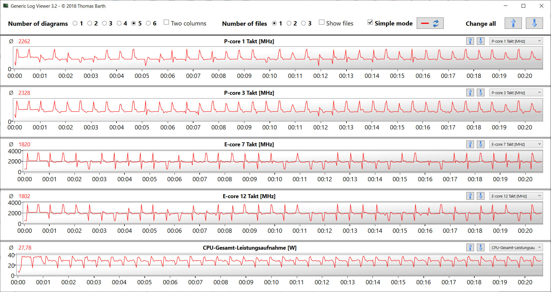 Test stresu (Prime95 i Furmark działające stale) reprezentuje ekstremalny scenariusz, który wykorzystujemy do oceny stabilności systemu pod pełnym obciążeniem. Procesor rozpoczyna test z niskim taktowaniem (P: 1,6 - 2,8 GHz; E: 1,6 - 1,7 GHz), a rdzeń graficzny pracuje z częstotliwością 1400 - 1800 MHz. Podczas gdy prędkość CPU spada w trakcie kontynuacji testu, prędkość GPU stabilizuje się na wysokim poziomie.