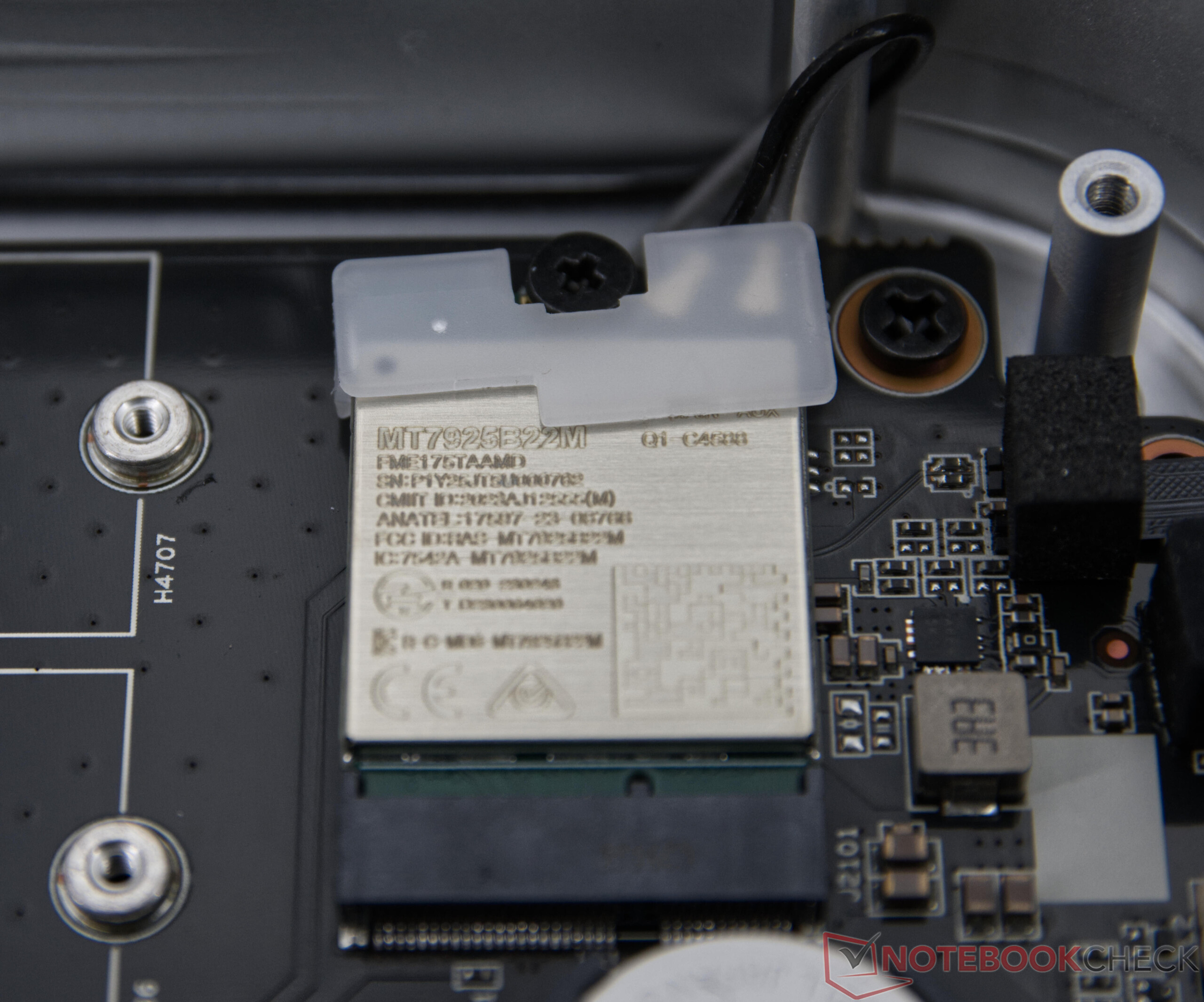 Konserwacja Minisforum AI X1 Pro-HX470 jest stosunkowo prosta: po odkręceniu kilku śrub można zdjąć spód. Aby uzyskać dostęp do pamięci RAM i dysku SSD, należy jednak zdemontować zasilacz i głośnik - należy zachować ostrożność ze względu na krótkie kable. Pamięć RAM, moduł WLAN i dysk SSD można wymienić lub rozszerzyć.