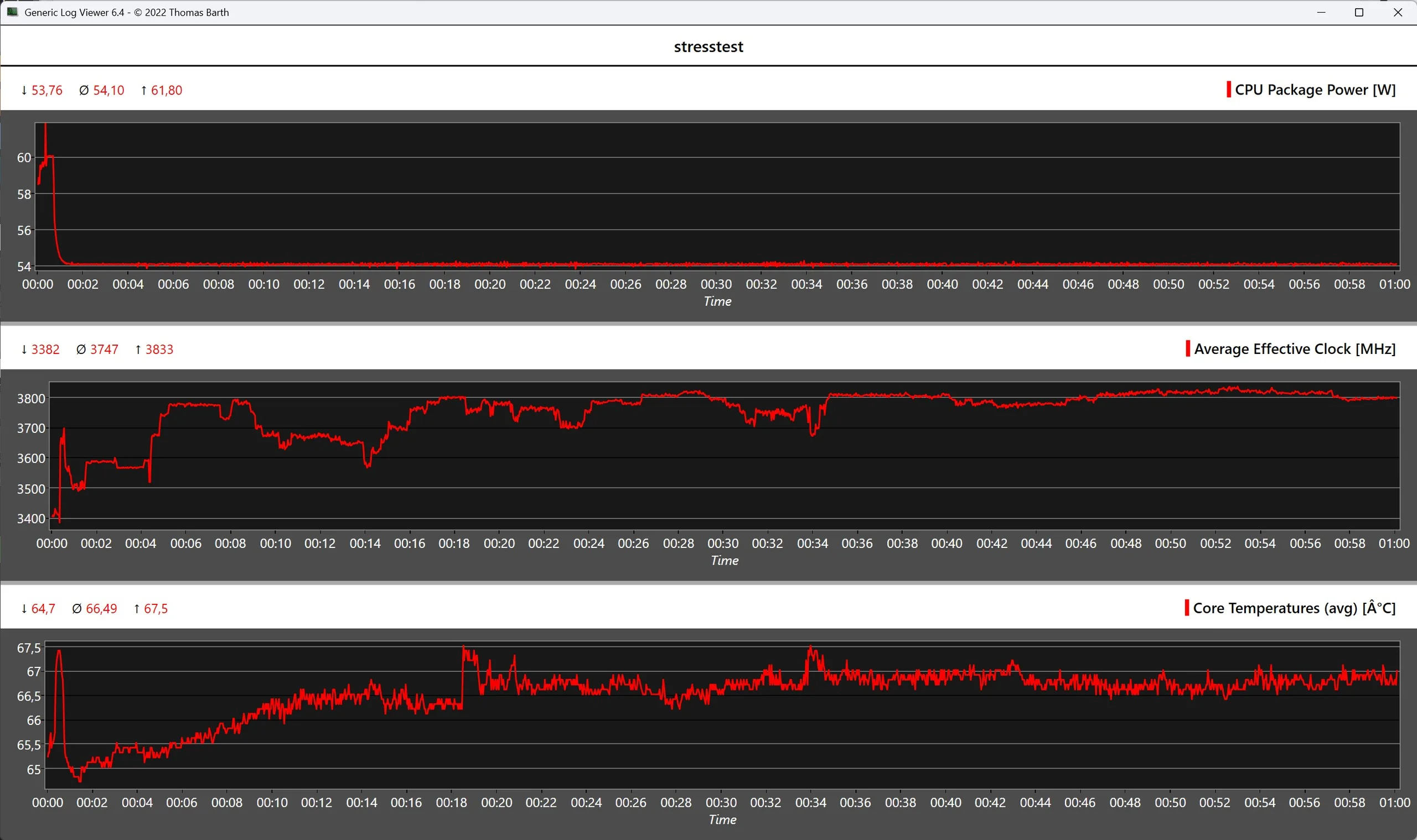 Pod względem termicznym Minisforum AI X1 Pro jest w doskonałej kondycji. Nawet przy długotrwałym pełnym obciążeniu, obudowa nagrzewa się do mniej niż 40 °C, podczas gdy SoC pozostaje wyraźnie w niekrytycznym zakresie z maksymalną temperaturą 67,5 °C.