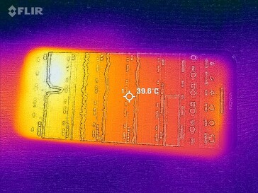 Przy dłuższym obciążeniu telefon może się znacznie nagrzewać: Zmierzyliśmy do 48,5 °C. Jest to wyraźnie odczuwalne. SoC również lekko dławi się pod dużym obciążeniem: W testach obciążeniowych 3DMark nadal mierzyliśmy 95,4% wydajności, która była dostępna na początku.