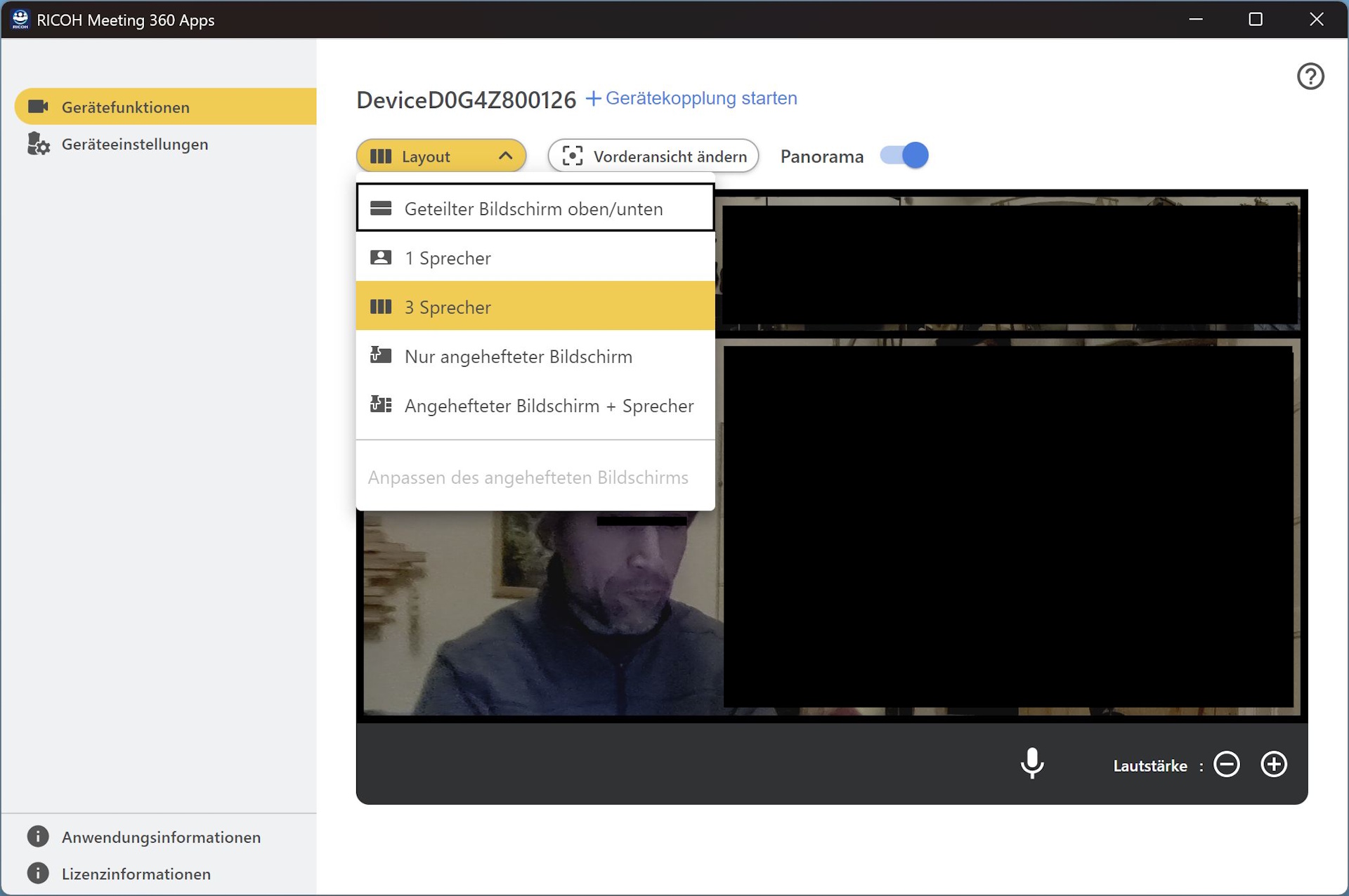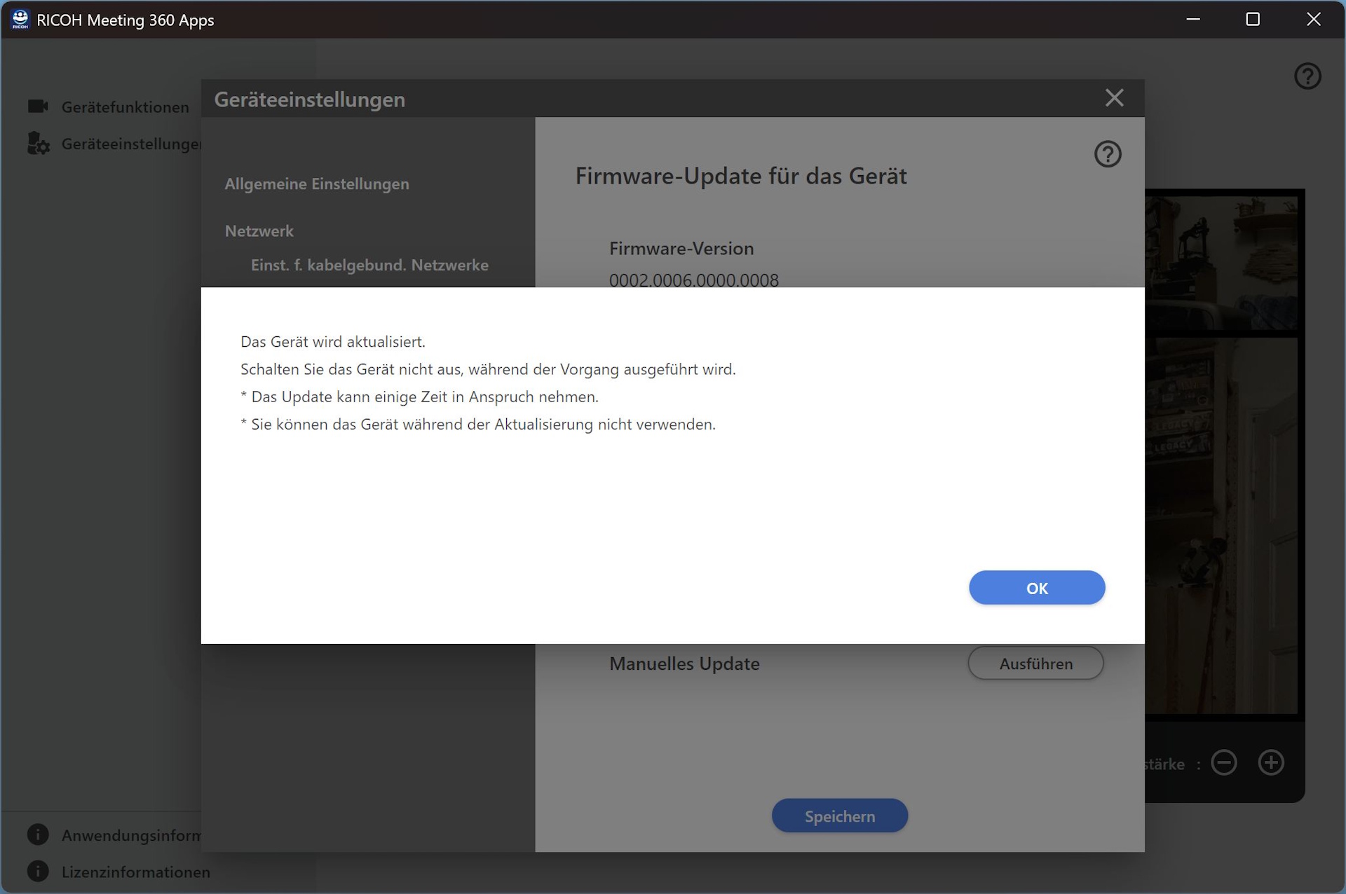 Ricoh udostępnia również aplikację Ricoh Meeting 360. Z tego miejsca użytkownicy mogą inicjować aktualizacje oprogramowania układowego (urządzenie musi być wcześniej podłączone przez sieć LAN), konfigurować preferencje układu i dostosowywać inne ustawienia.