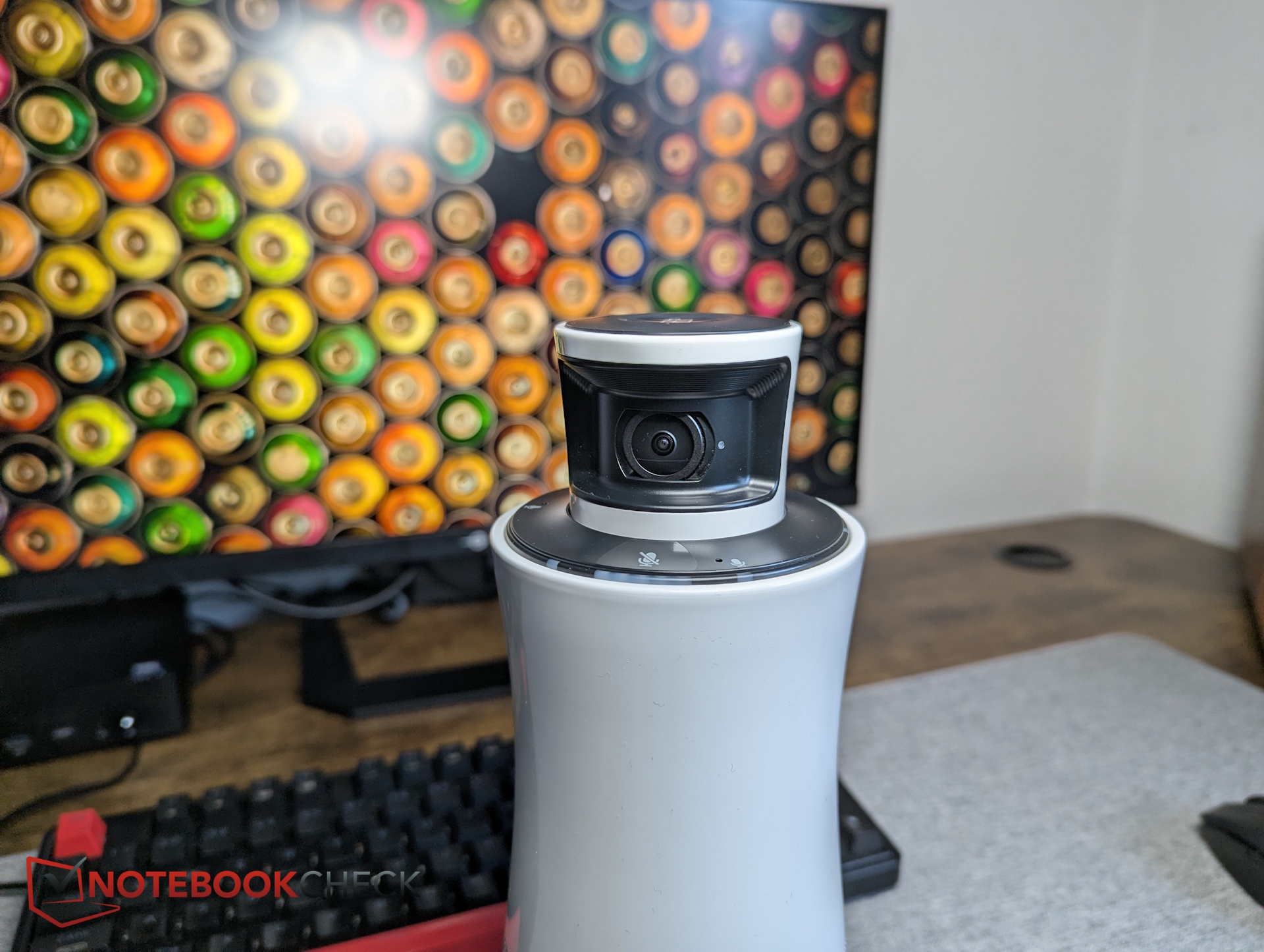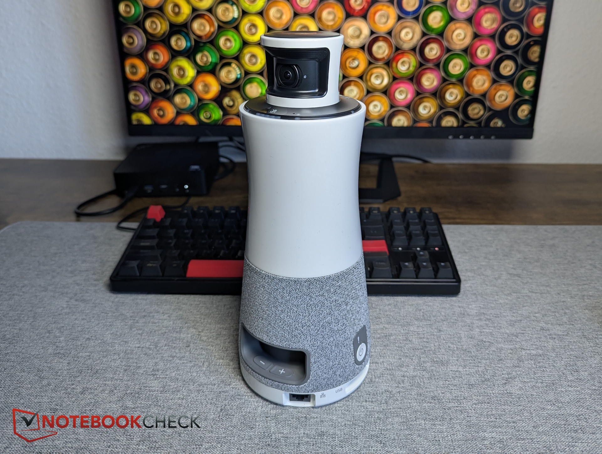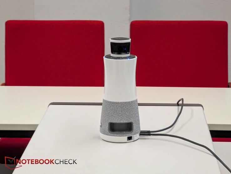 Plastikowa obudowa w kształcie kolumny umieszcza dwie 180-stopniowe kamery na samej górze. Ma to sens, ponieważ kamery wznoszą się ponad wyświetlaczami laptopów i innymi przeszkodami, umieszczając je blisko poziomu oczu bez blokowania linii wzroku uczestników. Trzy mikrofony również znajdują się na górze.