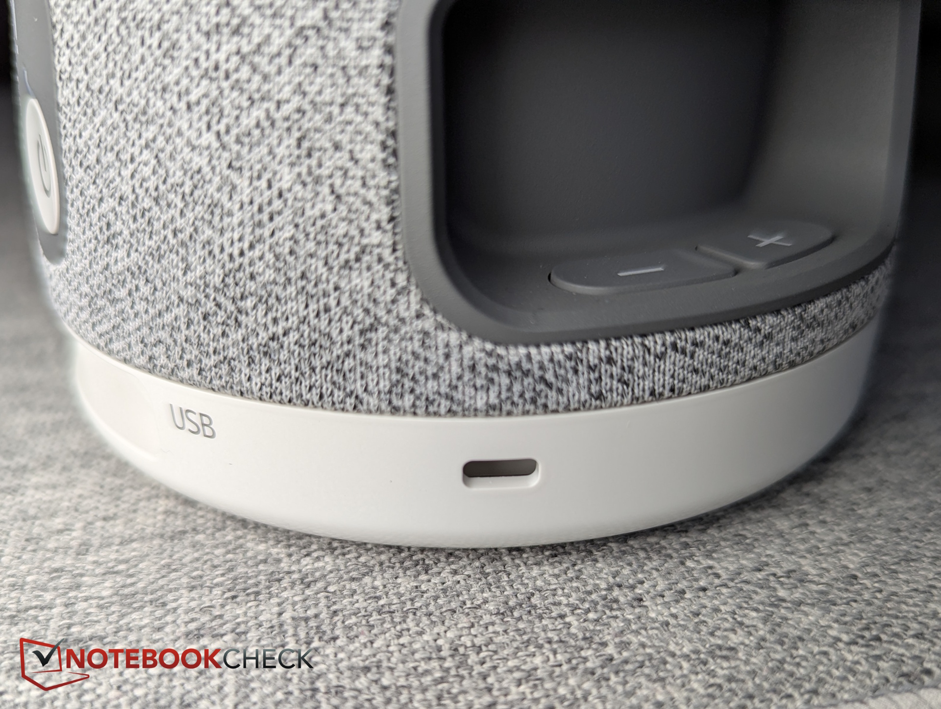 W dolnej jednej trzeciej znajdują się trzy głośniki owinięte szarą tkaniną. Przyciski głośności znajdują się po obu stronach urządzenia. Wszystkie porty znajdują się na dole.