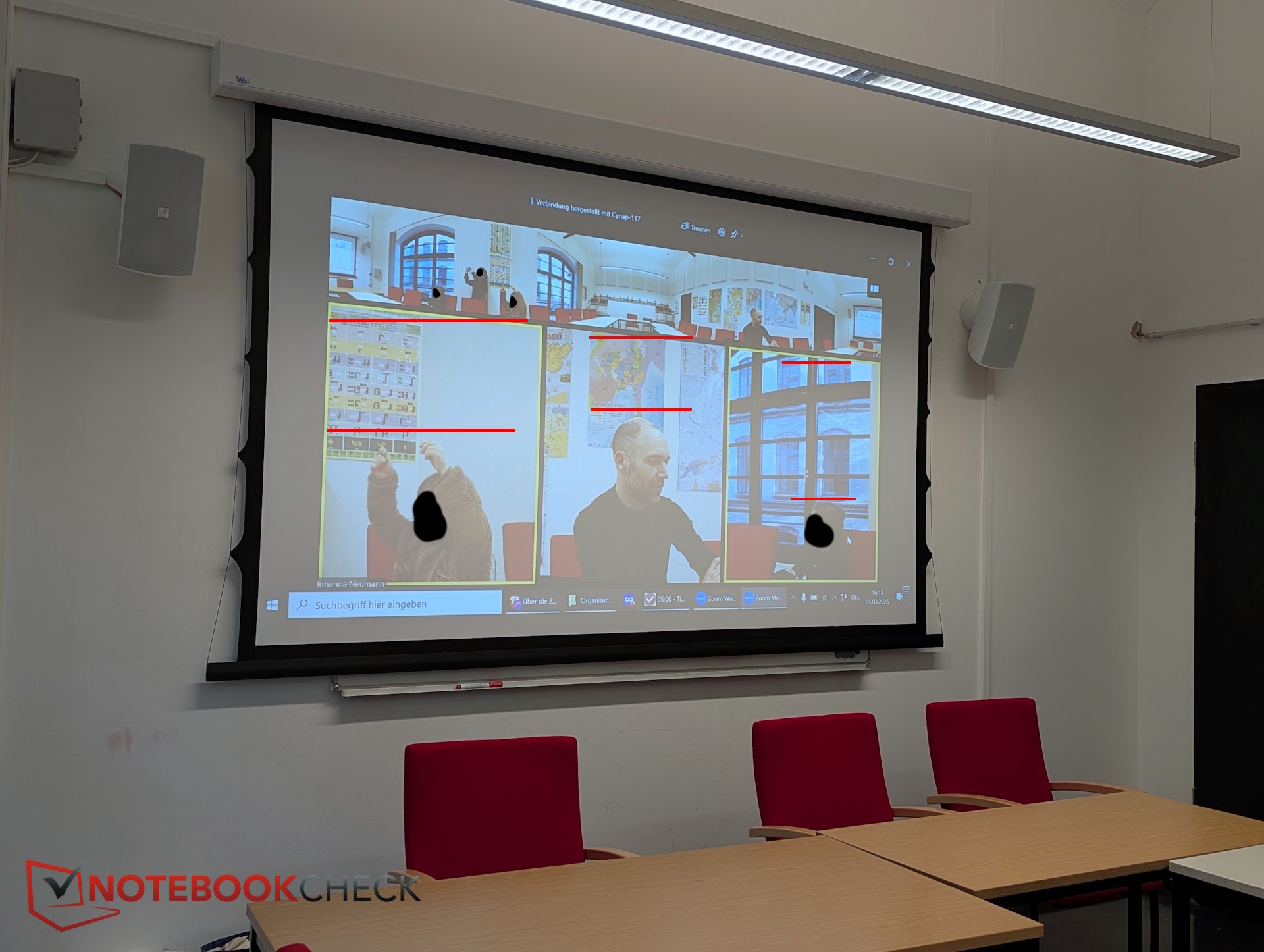 Wszystkie operacje zoomu są czysto cyfrowe. Jeśli ktoś siedzi z tyłu pokazanego tutaj pomieszczenia, obraz staje się dość mały i nieco rozmyty. System najlepiej nadaje się do mniejszych sal konferencyjnych, w których wszyscy siedzą przy tym samym stole. W scenariuszach seminaryjnych z bardziej odległymi uczestnikami, wydajność może stać się większym wyzwaniem. Ricoh określa zasięg wideo na 3,6 m.