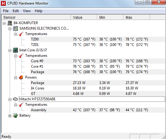 Zależnie od tego, o ile wzrośnie obciążenie, wentylator ma w zanadrzu jeszcze kilka szybszych trybów pracy. Będąca symboliczną granicą dobrego samopoczucia użytkownika wartość 40 dB została przekroczona tylko przy okazji długotrwałego obciążenia testem „piekielnym". Można więc powiedzieć, że Samsung 400B4B, choć głośniejszy od modeli określanych jako multimedialne, zachowuje poprawną kulturę pracy.