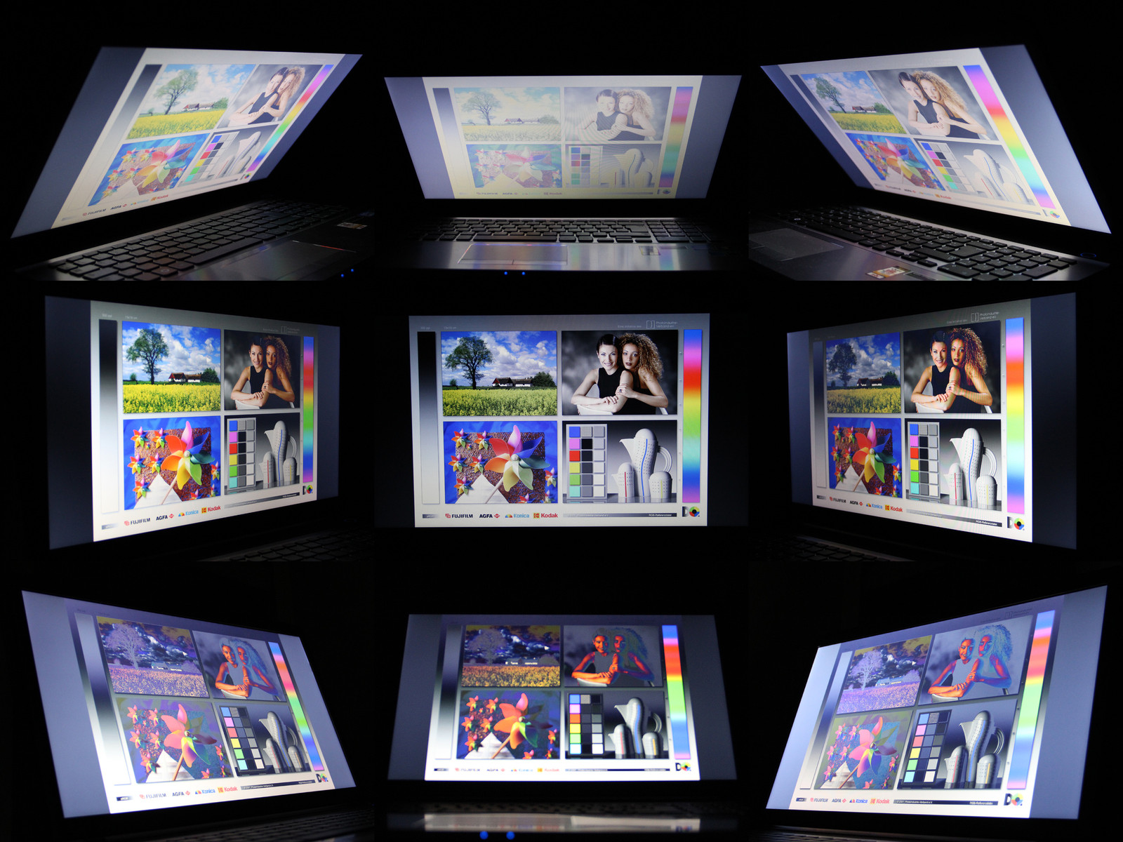 Pod względem kątów widzenia omawiany laptop prezentuje się raczej słabo, w każdym razie nie lepiej od innych modeli z popularnymi matrycami typu TN niskiej jakości. Odchylenia o kilka stopni od pozycji na wprost skutkują widocznymi przekłamaniami wyświetlanych treści. Szczególnie dotyczy to płaszczyzny pionowej. W poziomie zakres użyteczny jest szerszy, ale wystarczający dla co najwyżej 2-3 osób siedzących obok siebie.