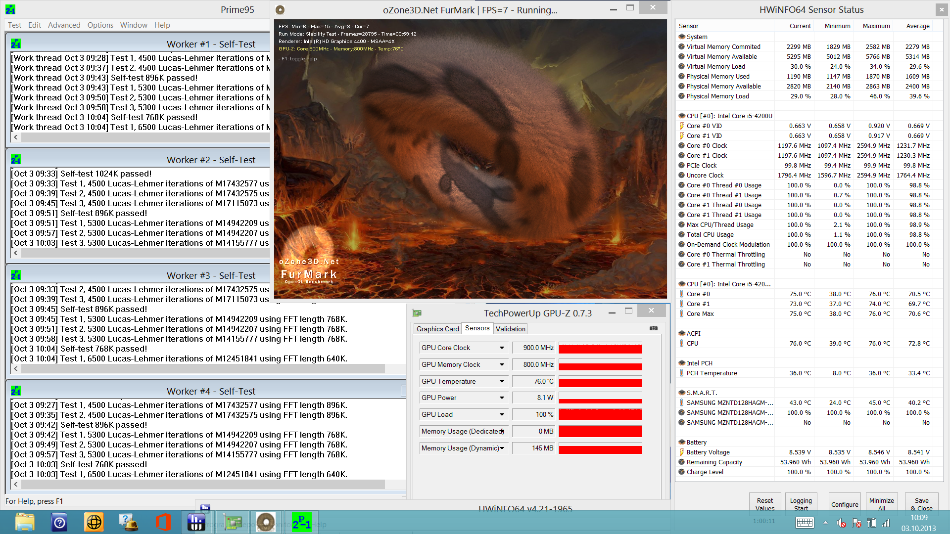 W teście pełnego obciążenia taktowanie procesora i5-4200U zostało obniżone do 1,2 GHz, ale nie z powodu zbyt wysokiej temperatury CPU. Temperatura rdzeni osiągnęła maksymalnie 76°C. Taktowanie zintegrowanego układu grafiki wynosiło 900 MHz.