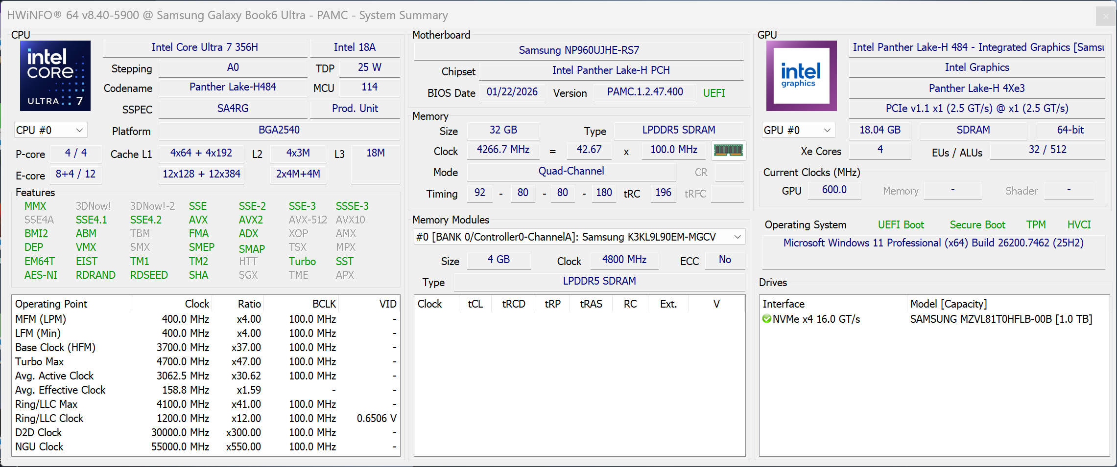 Samsung odświeża swój najpotężniejszy laptop, Galaxy Book6 Ultra. 16-calowe urządzenie multimedialne wyposażono teraz w nowe układy Intel Panther Lake, opcjonalne procesory graficzne Nvidia Blackwell, a także nowy ekran dotykowy OLED w zmienionej obudowie. Recenzujemy model z procesorem Core Ultra 7 356H, kartą graficzną GeForce RTX 5070, 32 GB pamięci RAM i dyskiem SSD o pojemności 1 TB.