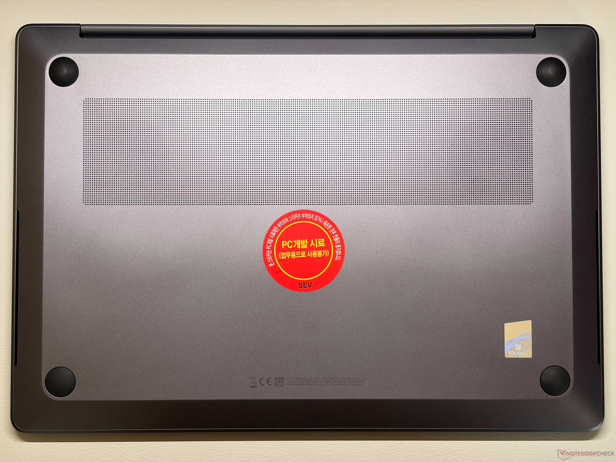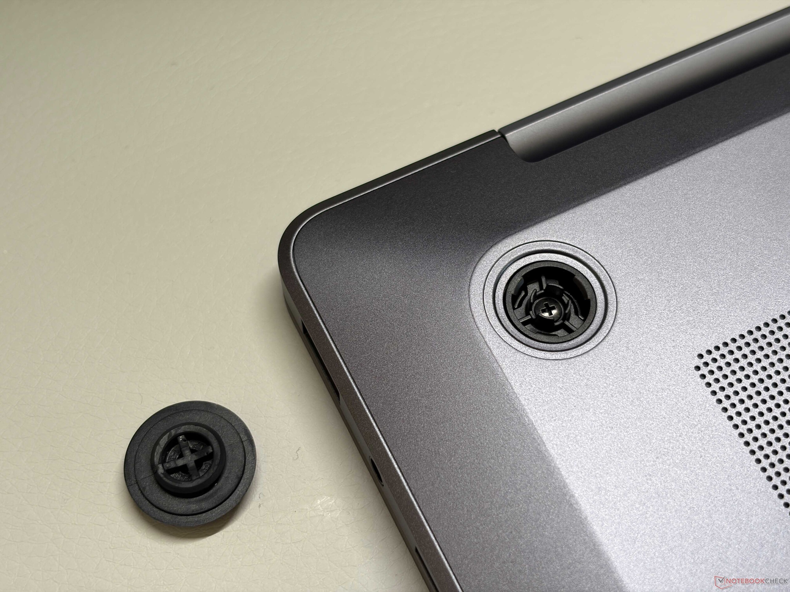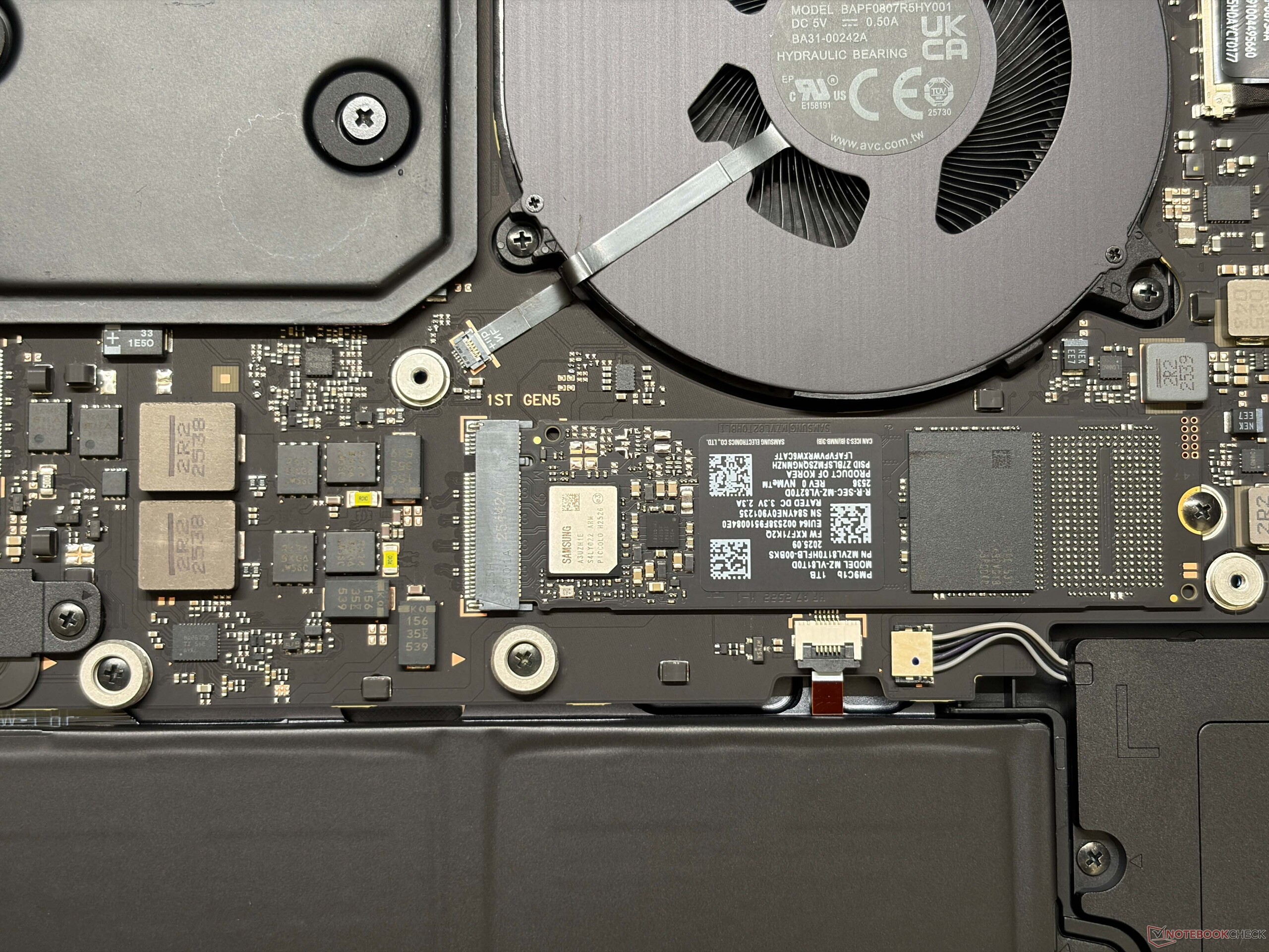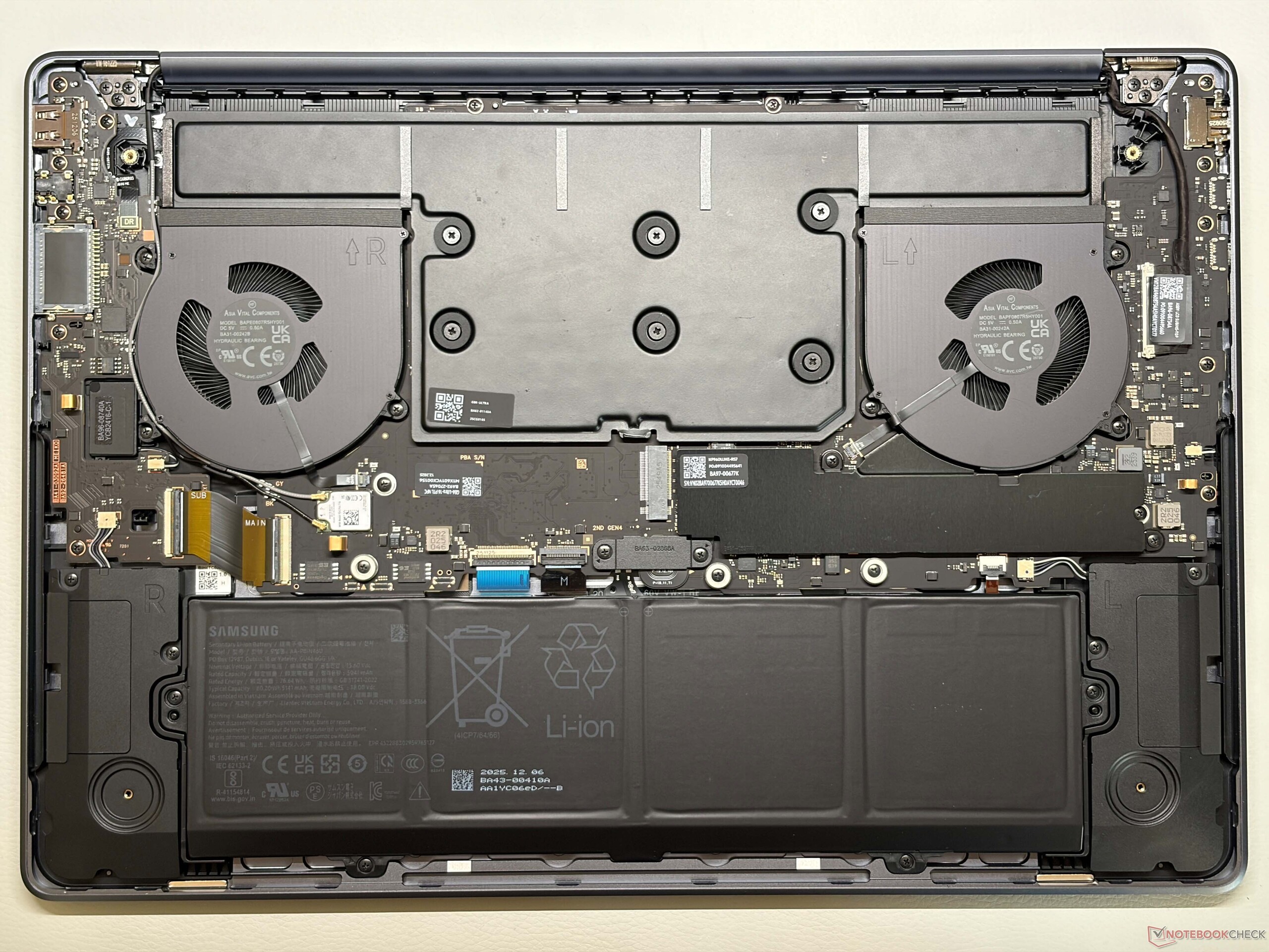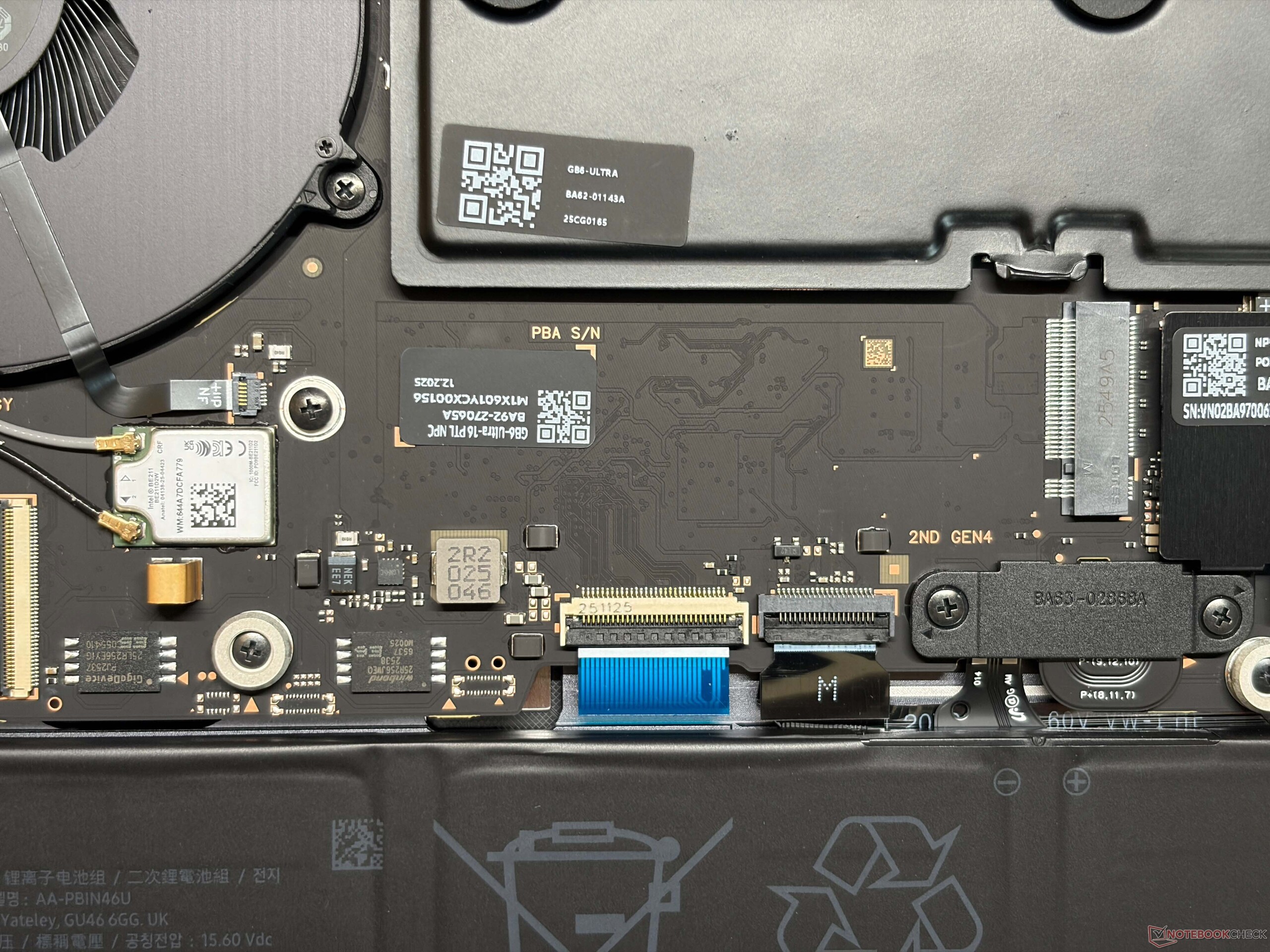 Samsung zrezygnował z poprzedniej konstrukcji z jednostką bazową w kształcie klina (która jest nadal używana w innych modelach Galaxy Book6), a nowy Galaxy Book6 Ultra wygląda i jest znacznie bardziej podobny do MacBooka Pro 16. Jesteśmy prawie pewni, że wielu użytkowników miałoby trudności z rozróżnieniem tych dwóch modeli, gdyby usunęli Państwo logo. Ogólna jakość Galaxy Book6 Ultra z aluminiową obudową jest doskonała, zarówno pod względem stabilności, jak i jakości wykonania. Odciski palców są jednak problemem, a powierzchnie nie są łatwe do czyszczenia. Nie jesteśmy zadowoleni z zawiasów (maksymalny kąt otwarcia ~135 stopni), ponieważ ekran dość mocno się chwieje. Dolna ramka jest również bardzo gruba. Można zdjąć dolny panel i uzyskać dostęp do obu gniazd SSD, baterii, a także wentylatorów, ale pamięci i modułu Wi-Fi nie można wymienić.