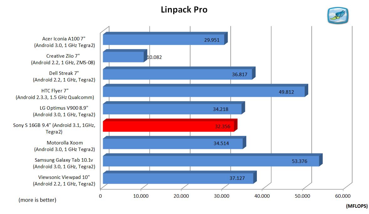 Sony S uzyskał bardzo dobre wyniki w teście Google V8 (JavaScript, prędkość przeglądarki internetowej). LG V900 i Motorola Xoom są tutaj tylko trochę szybsze. Linpack Pro (liczba operacji zmiennoprzecinkowych na sekundę), który mierzy potencjał wydajnościowy CPU, stawia tablety z układem Tegra 2, a wśród nich Sony S, właściwie na równi. Ze stawki udało się wybić (na korzyść) tylko Samsungowi Galaxy Tab 10.1.