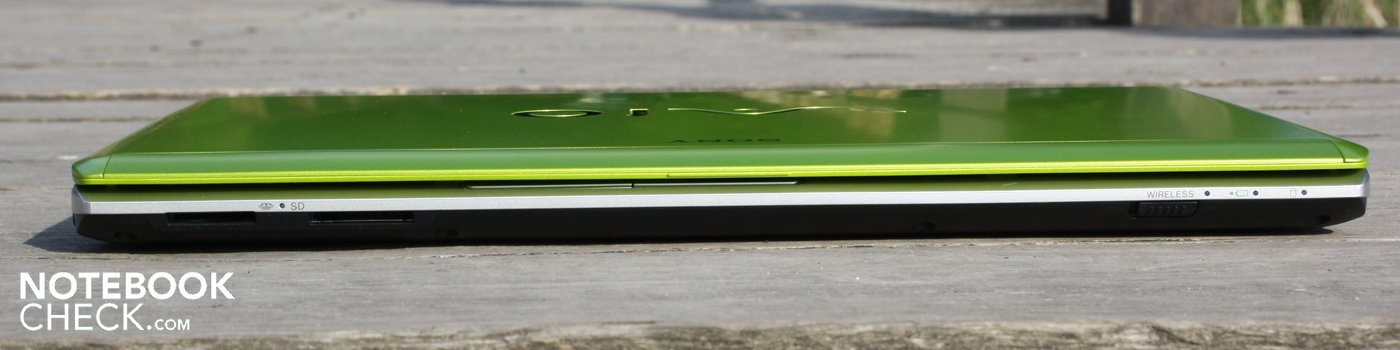 Złącza w Vaio Y21S1E są rozdzielone równo pomiędzy dwie ścianki boczne. Na przedniej krawędzi obudowy znajdują się dwa czytniki kart. Z tyłu umieszczono tylko akumulator.
