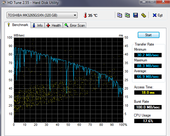 Zamontowany seryjnie dysk Toshiby o pojemności 320 GB prezentuje przeciętną wydajność.