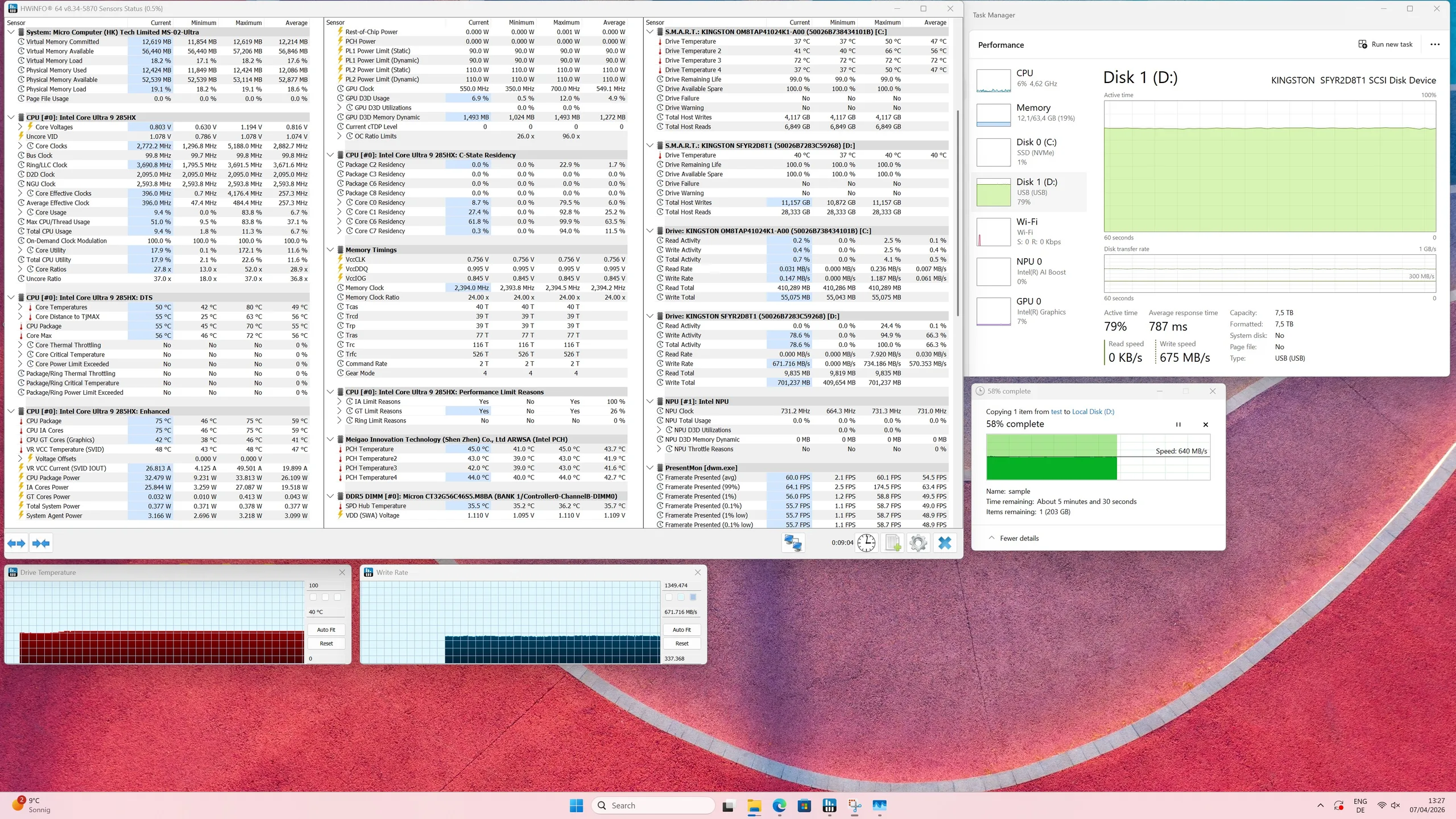 W teście temperaturowym i obciążeniowym dysk SSD TerraMaster D1 w połączeniu z dyskiem Kingston Fury Renegade G5 8 TB uzyskał przekonujące wyniki. Nawet przy długotrwałym obciążeniu temperatury pozostają w bezpiecznym zakresie dzięki aluminiowej obudowie i skutecznemu chłodzeniu. Nie ma żadnych spadków wydajności ani oznak dławienia, co zapewnia stałą szybkość transferu.