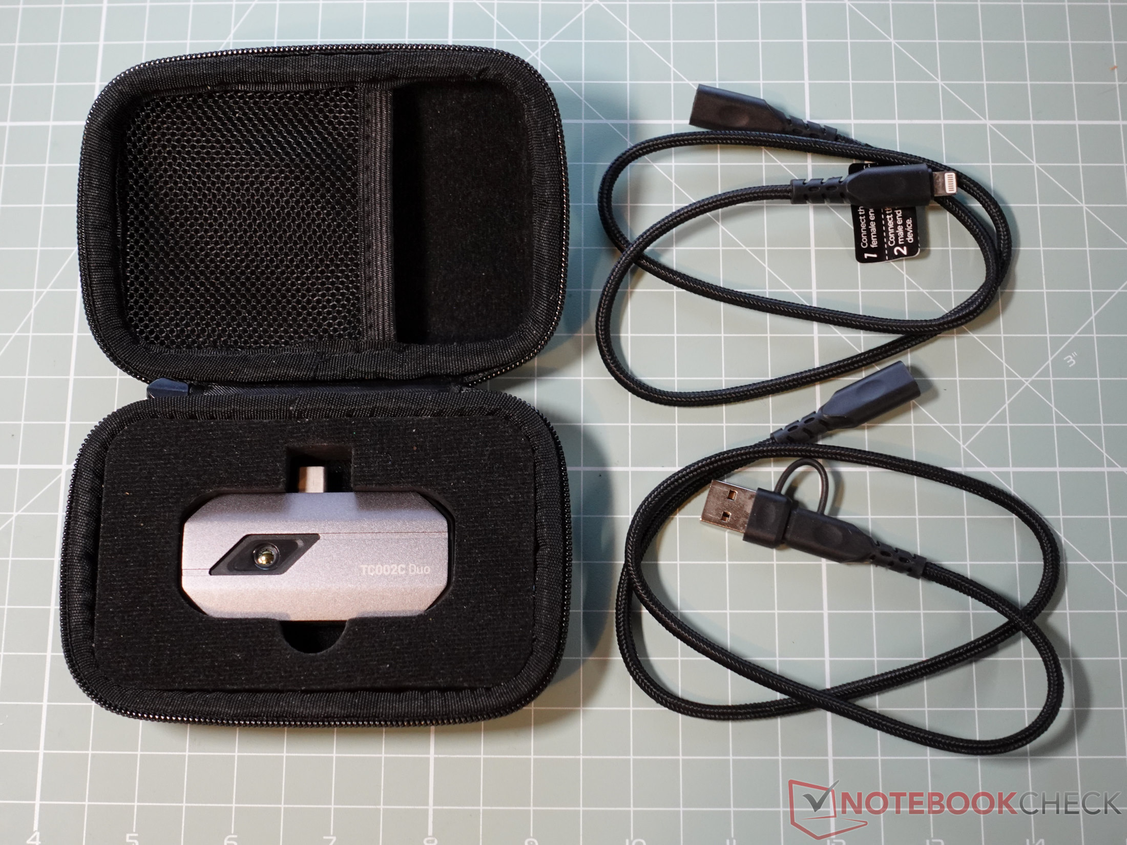 Kamera TC002C Duo jest zamknięta w wytrzymałej obudowie z aluminium i tworzywa sztucznego, co sugeruje, że jest dobrze przygotowana do pracy w wymagających warunkach. Waga samej kamery wynosi zaledwie 29 g, a cały zestaw - wraz z akcesoriami - waży 130 g. Topdon zawiera praktyczny futerał i kable adapterowe do laptopów i iPhone'ów ze złączami Lightning.