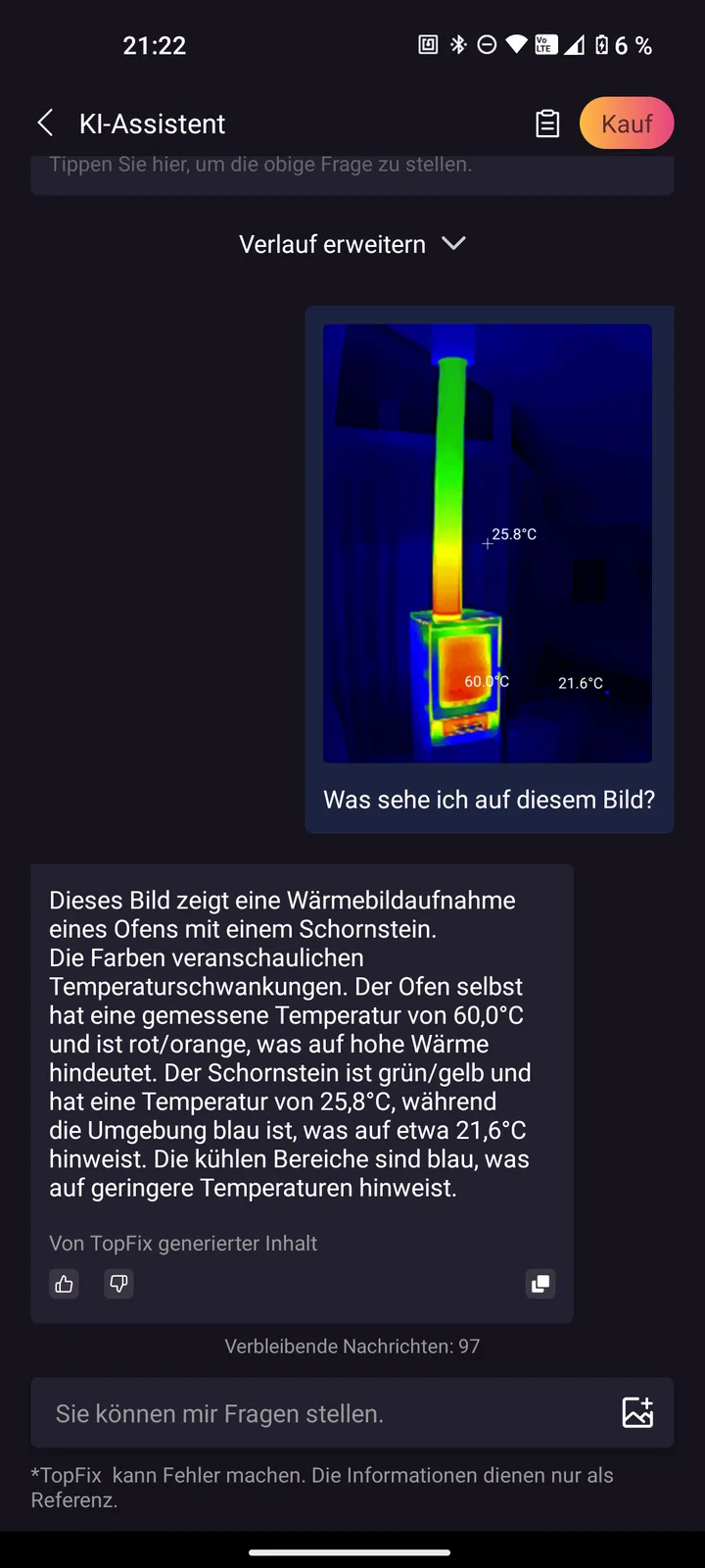 Jednak prawdziwa moc tkwi w Topinfrared - aplikacji Android i iOS dla kamery termowizyjnej. Oferuje ona rozbudowany zestaw funkcji do tworzenia i edycji obrazów termowizyjnych, a także pomocne samouczki i narzędzia do raportowania. Aplikacja zawiera nawet asystenta AI, który może być korzystny w określonych zastosowaniach. TopFix został zaprojektowany do identyfikacji szkodników, wycieków, obwodów i hotspotów; funkcja ta wymaga jednak konta użytkownika, ponieważ sztuczna inteligencja działa w chmurze. Po rejestracji otrzymują Państwo 100 odpowiedzi od chatbota (obecnie w wersji beta - doładowania tokenów nie są jeszcze dostępne).