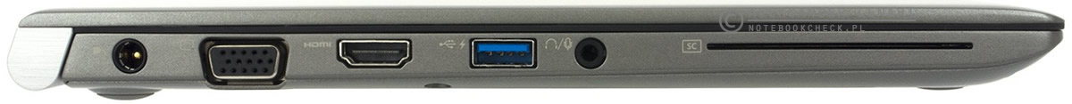 Rozmieszczenie portów peryferyjnych jest niezłe. Z prawej strony pozostawiono sporo wolnego miejsca na operowanie myszką. Na uznanie zasługuje także dość urozmaicony zestaw złączy. Na wyposażeniu Toshiby Z30-C-125 znalazły się trzy porty USB 3.0 (w tym jeden z funkcją ładowania), LAN, HDMI, D-Sub, czytnik Smart Card, czytnik kart SD oraz gniazdo audio. Na spodzie umieszczono port dokowania.