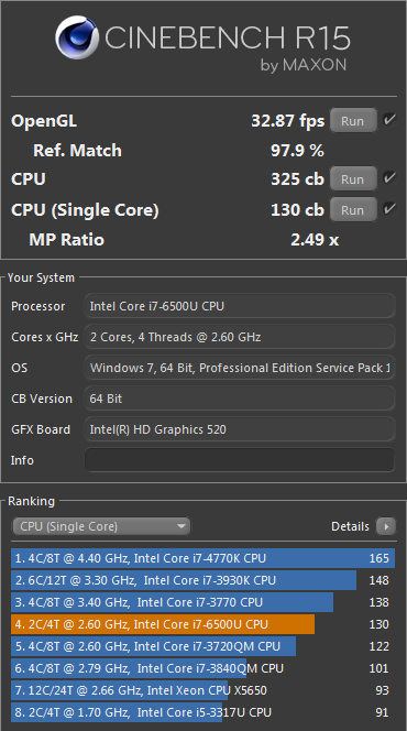 Omawiany laptop ukończył testy aplikacji Cinebench R15, uzyskując następujące rezultaty: 130 pkt. (jednowątkowy) i 325 pkt. (wielowątkowy). W starszej Toshibie Z30-B, wyposażonej w procesor i7-5500U, było to odpowiednio 123 i 291 pkt. Postęp, jak widać, jest, ale raczej ewolucyjny a nie rewolucyjny.