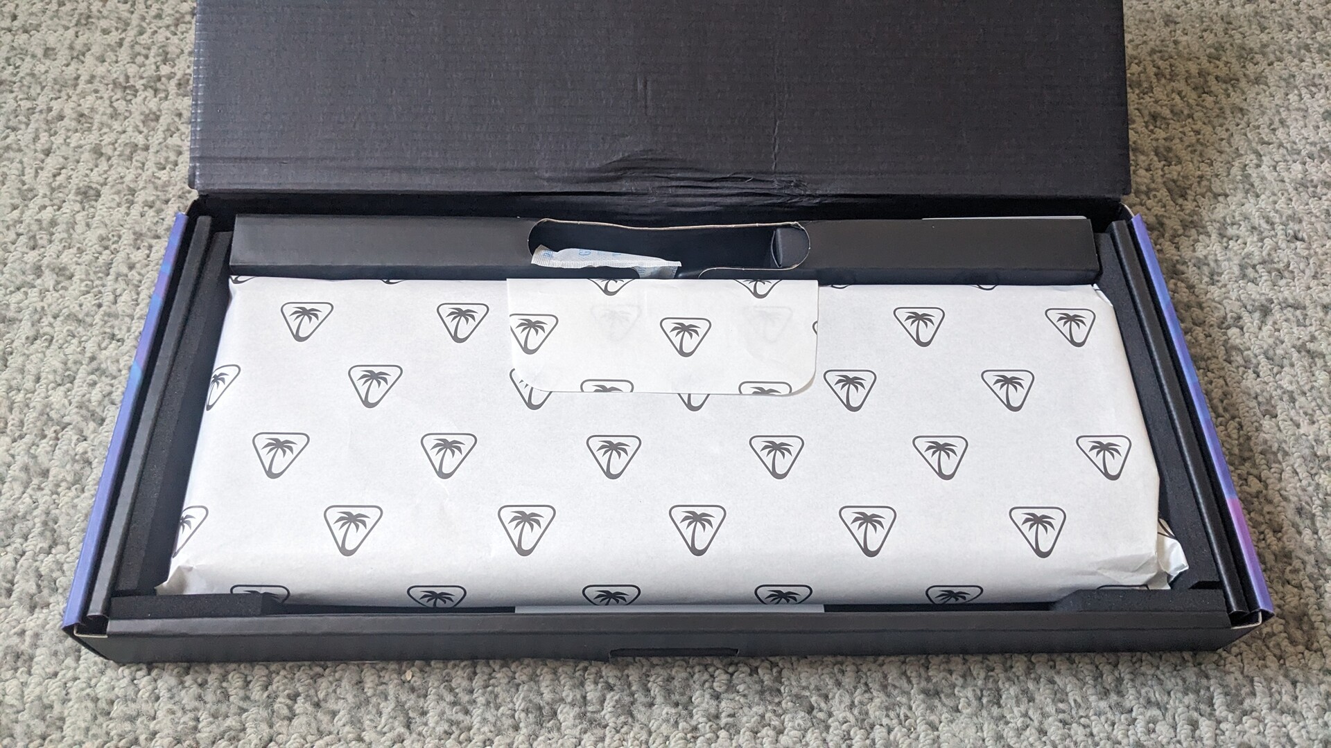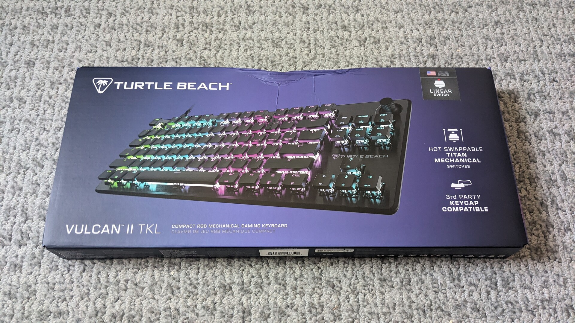 Najnowsza klawiatura do gier Turtle Beach dostarczana jest w fioletowym prostokątnym pudełku, z urządzeniem peryferyjnym owiniętym w bibułkę. Kupujący otrzymują również ściągacz do przełączników, odłączany kabel USB-C o długości 1,8 m oraz trzy zapasowe przełączniki liniowe Titan HS.