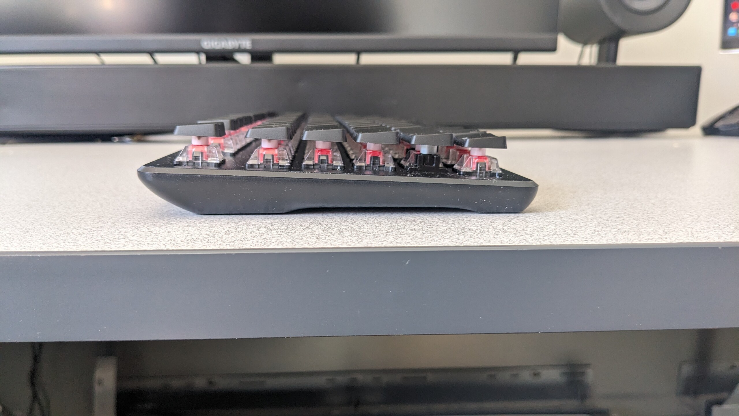 Chociaż w jej konstrukcji znajduje się spora ilość plastiku, aluminiowa płyta górna zapewnia stabilną platformę do pisania. Nasadki klawiszy ABS są gładkie w dotyku, ale powierzchnia poniżej jest lekko ziarnista, aby kontrolować odciski palców.