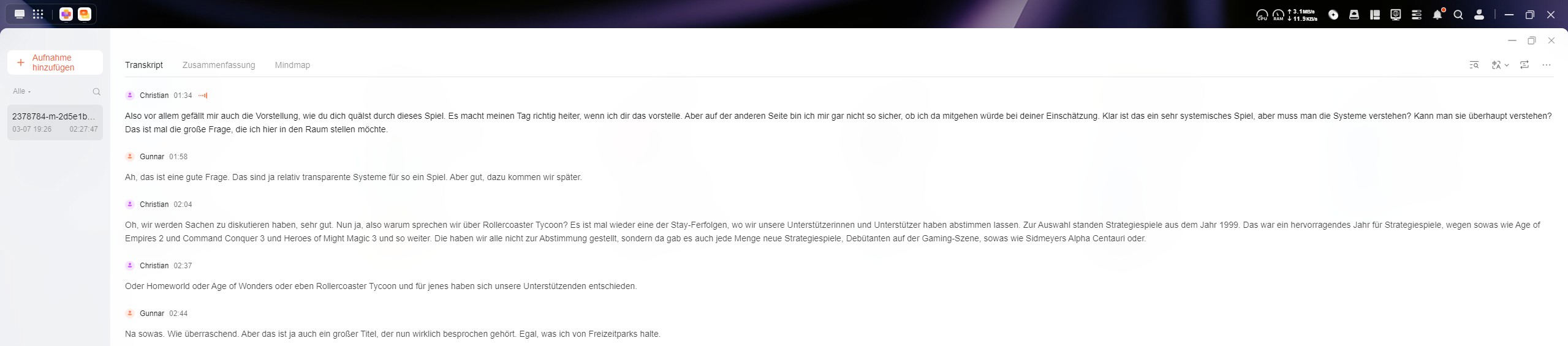 Za pomocą aplikacji można transkrybować i podsumowywać pliki audio. Szczegółowo oceniliśmy tę funkcję, korzystając z odcinek 161 podcastu Stay Forever. Odcinek podcastu trwa niecałe 2 godziny i 30 minut, a transkrypcja zajęła 10 minut. Transkrypcja jest bardzo użyteczna. Dłuższe monologi są czasami dzielone na dwa oddzielne wpisy, ale jest to całkowicie nieszkodliwe. Istnieją drobne odchylenia; na przykład jedna fraza została rozpoznana nieprawidłowo zamiast poprawnego sformułowania. Rozpoznawanie mówcy działa niezawodnie, a zarówno nazwy mówców, jak i samą transkrypcję można edytować. Kliknięcie odpowiedniego tekstu powoduje odtworzenie odpowiedniej sekcji. Ogólnie rzecz biorąc, wrażenia użytkownika są bardzo dobre. Transkrypcję można wyeksportować jako sformatowany dokument DOCX. Można również wygenerować podsumowanie, a nawet stworzyć mapę myśli.