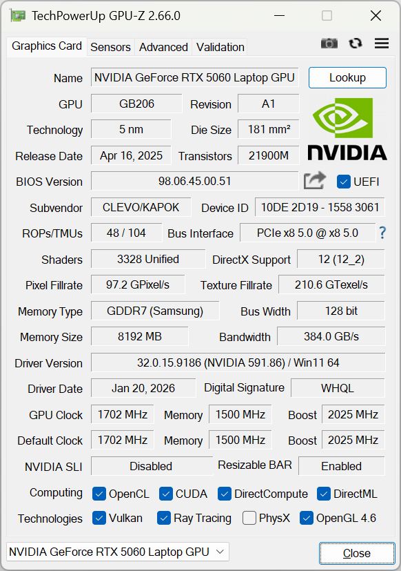 | Schenker XMG Apex 17 M25 R9 9955HX, GeForce RTX 5060 Laptop | Lenovo Legion 7 16IAX10 Ultra 7 255HX, GeForce RTX 5060 Laptop | HP Omen 16-ap0091ng R9 8940HX, GeForce RTX 5060 Laptop | MSI Cyborg 17 B13WFKG i7-13620H, GeForce RTX 5060 Laptop | Tulpar T6 V3.5 i7-14700HX, GeForce RTX 5060 Laptop | Alienware 16 Aurora Core 7 240H, GeForce RTX 5060 Laptop | |