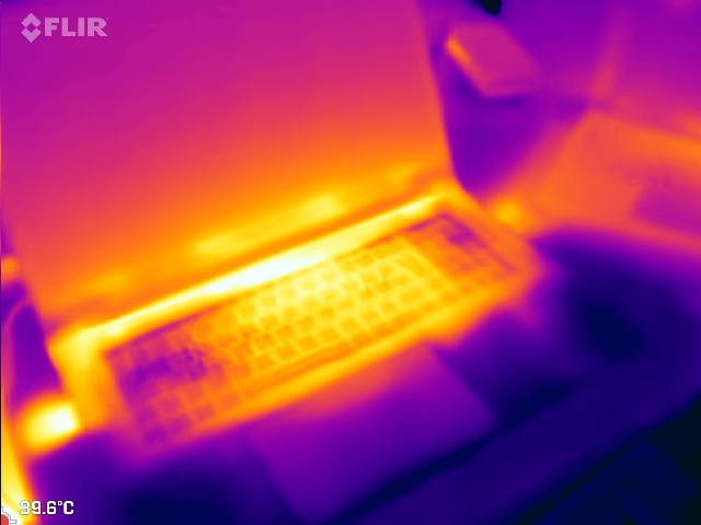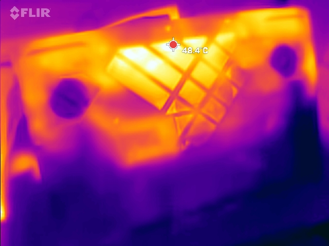 Głośny system chłodzenia utrzymuje ogólnie niskie temperatury. Pod obciążeniem, gorące punkty o temperaturze około 45°C są mierzone centralnie na spodzie, podczas gdy inne obszary pozostają znacznie chłodniejsze.