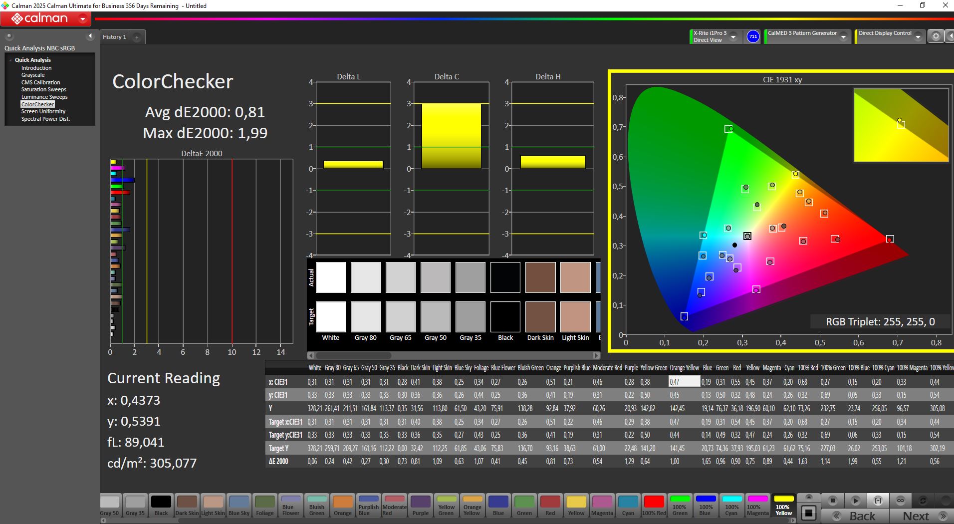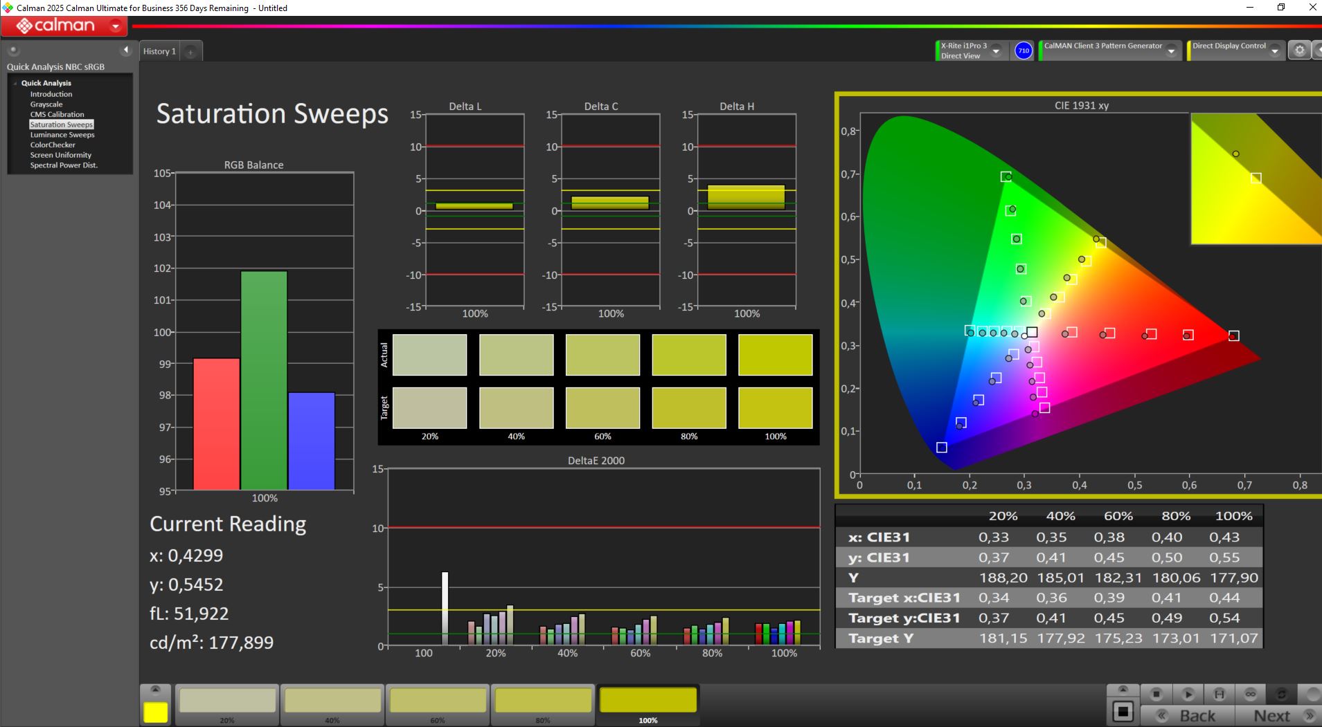 Po wyjęciu z pudełka kalibracja jest słaba, z wysokimi odchyleniami DeltaE. Po ręcznej ponownej kalibracji zmniejszyliśmy odchylenia skali szarości i kolorów poniżej 1 - doskonałe wyniki. Nasz skalibrowany profil ICC jest dostępny do pobrania powyżej.