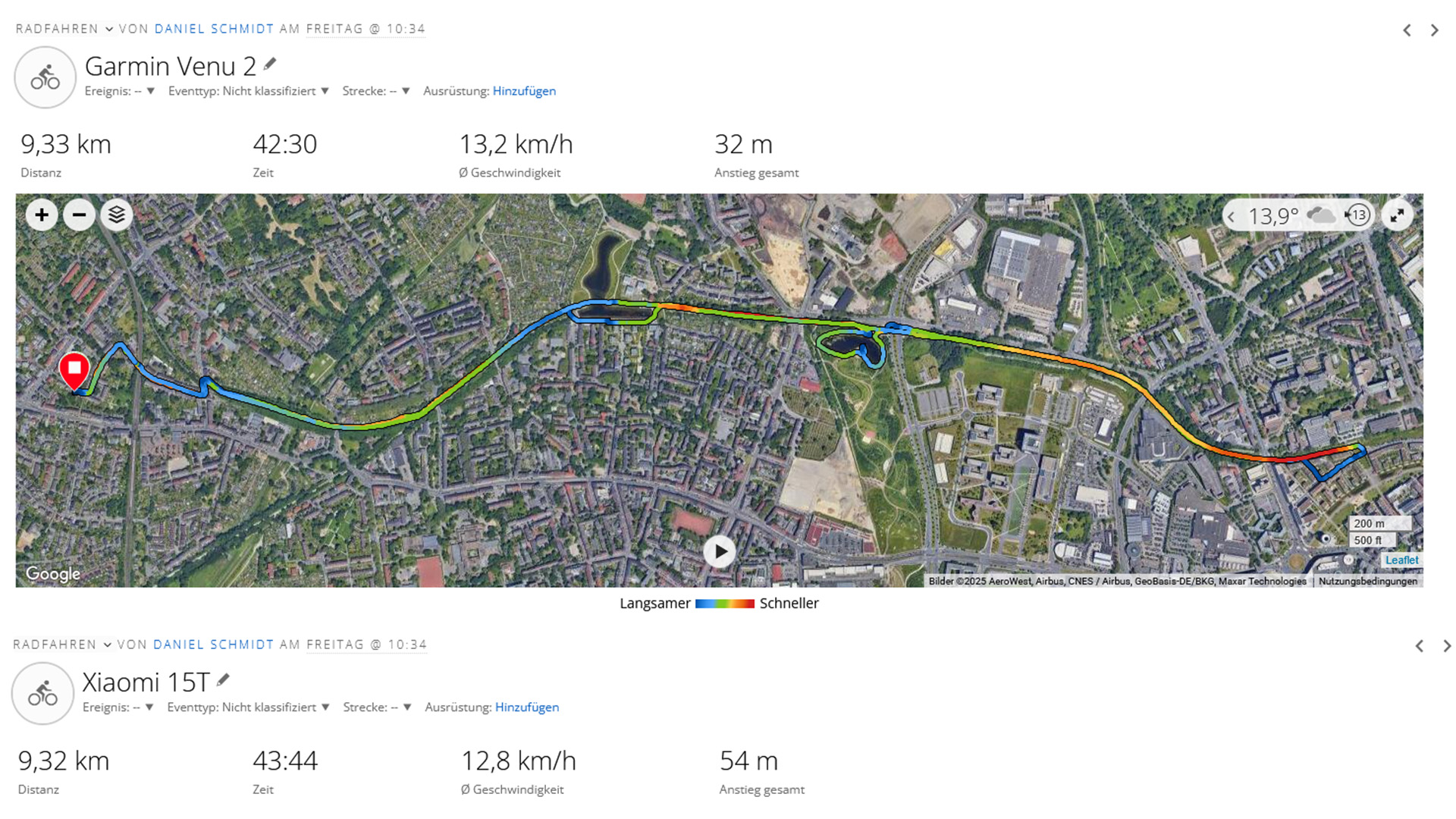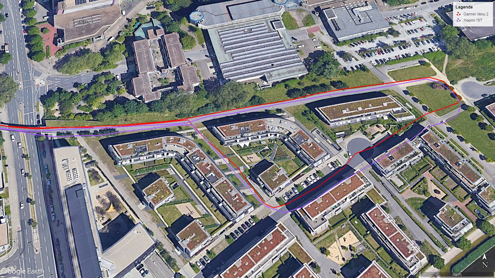 Telefon Xiaomi szybko wykonuje Satfix na zewnątrz z wysoką dokładnością do 1 metra. W naszym praktycznym teście porównujemy Xiaomi 15T ze smartwatchem Garmin (Venu 2). Oba mają pewne niedokładności, ale pozycjonowanie telefonu średniej klasy jest więcej niż wystarczające do zadań nawigacyjnych.