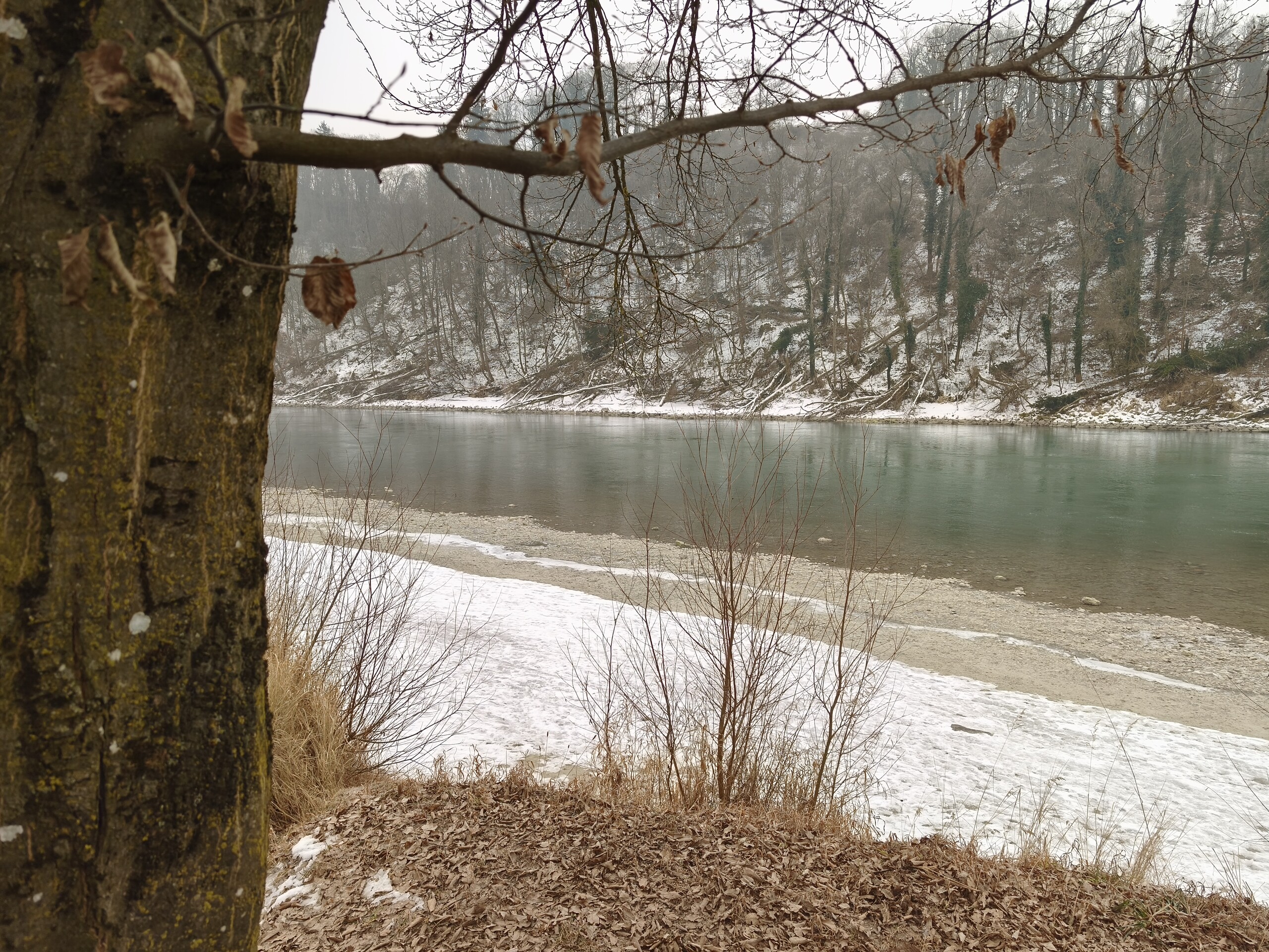 Na ujęciu szlaku turystycznego i rzeki, drzewo z liśćmi wygląda na nadmiernie wyostrzone, a ogólna ostrość jest niedokładna.