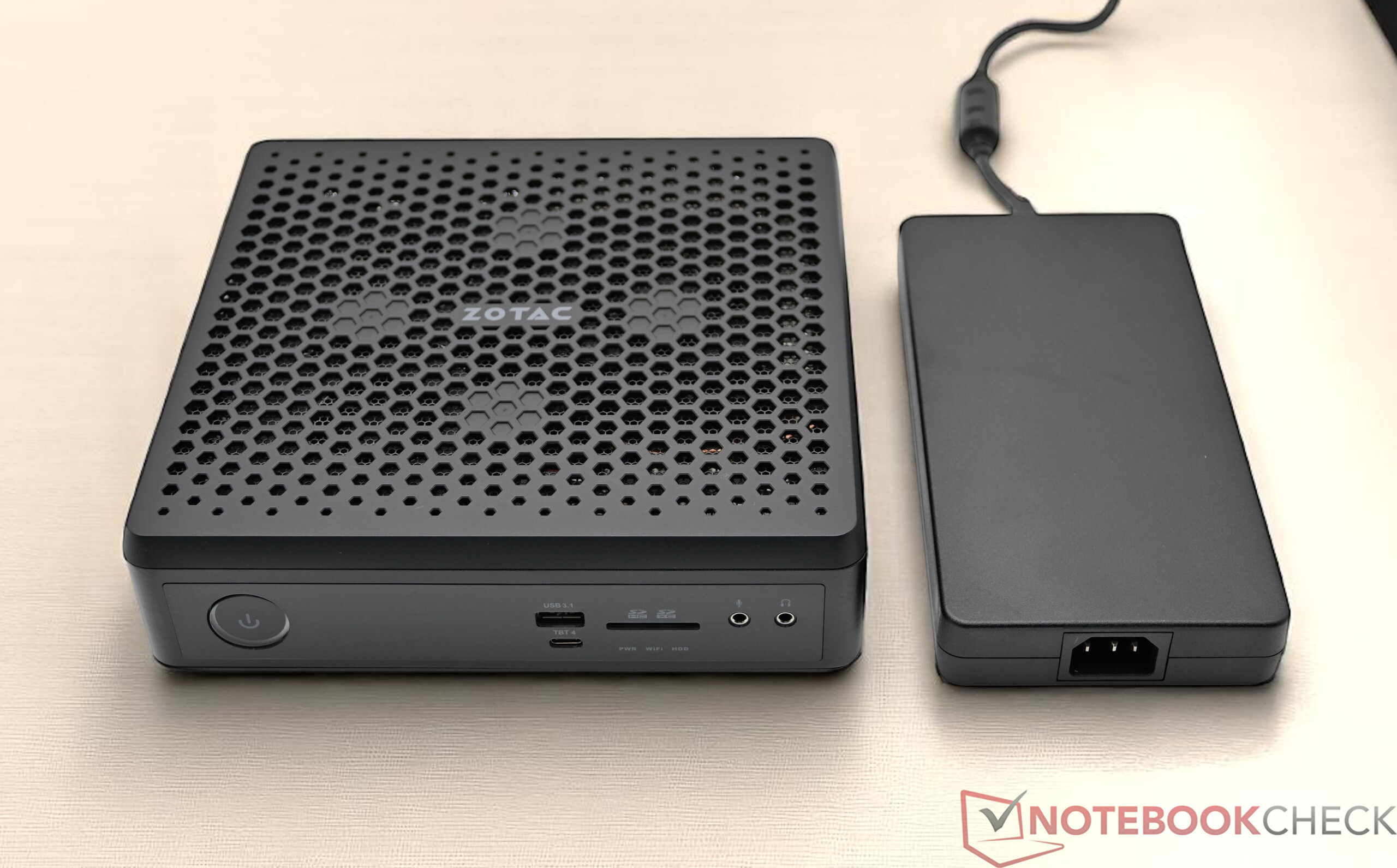 Na biegu jałowym, pobór mocy Zotac Zbox Magnus EN374070 jest podobny do tego z Minisforum AtomMan G7 Ti. Jednak urządzenia takie jak Asus ROG NUC pokazują, że nawet niższe wartości są możliwe dzięki bardziej wydajnym SoC. Pod średnim obciążeniem zmierzyliśmy około 103 watów, osiągając na krótko 230 watów - to dobra wartość, biorąc pod uwagę potężny sprzęt. Dołączony zasilacz może dostarczyć do 330 watów, co jest więcej niż wystarczające.